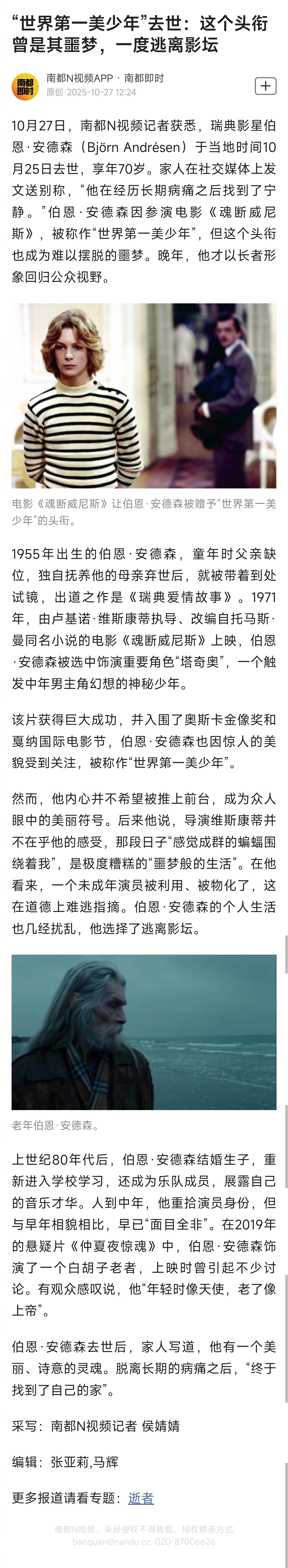 #世界第一美少年曾称此头衔是其噩梦#【#世界第一美少年去世#:这个头衔曾是其噩梦,一度逃离影坛】10月27日,南都N视频记者获悉,瑞典影星伯恩·安德森(Björn Andrésen)于当地时间10月25日去世,享年70岁。家人在社交媒体上发文送别称,“他在经历长期病痛之后找到了宁静。”伯恩·安德森因参演电影《魂断威尼斯》,被称作“世界第一美少年”,但这个头衔也成为难以摆脱的噩梦。晚年,他才以长者形象回归公众视野。