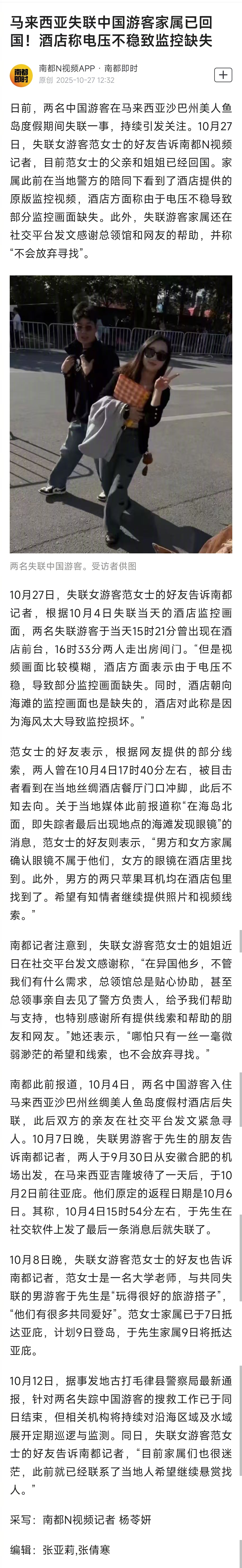 【#马来西亚失联中国游客家属已回国#!酒店称电压不稳致监控缺失】日前,两名中国游客在马来西亚沙巴州美人鱼岛度假期间失联一事,持续引发关注。10月27日,失联女游客范女士的好友告诉南都N视频记者,目前范女士的父亲和姐姐已经回国。家属此前在当地警方的陪同下看到了酒店提供的原版监控视频,酒店方面称由于电压不稳导致部分监控画面缺失。此外,失联游客家属还在社交平台发文感谢总领馆和网友的帮助,并称“不会放弃寻找”。