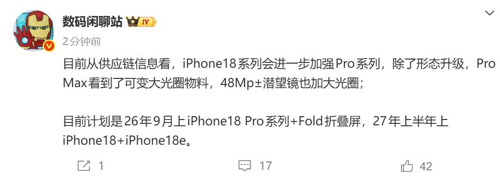 2026年9月:iPhone 18 Pro系列 + Fold折叠屏2027上半年 :iPhone 18 + iPhone 18e