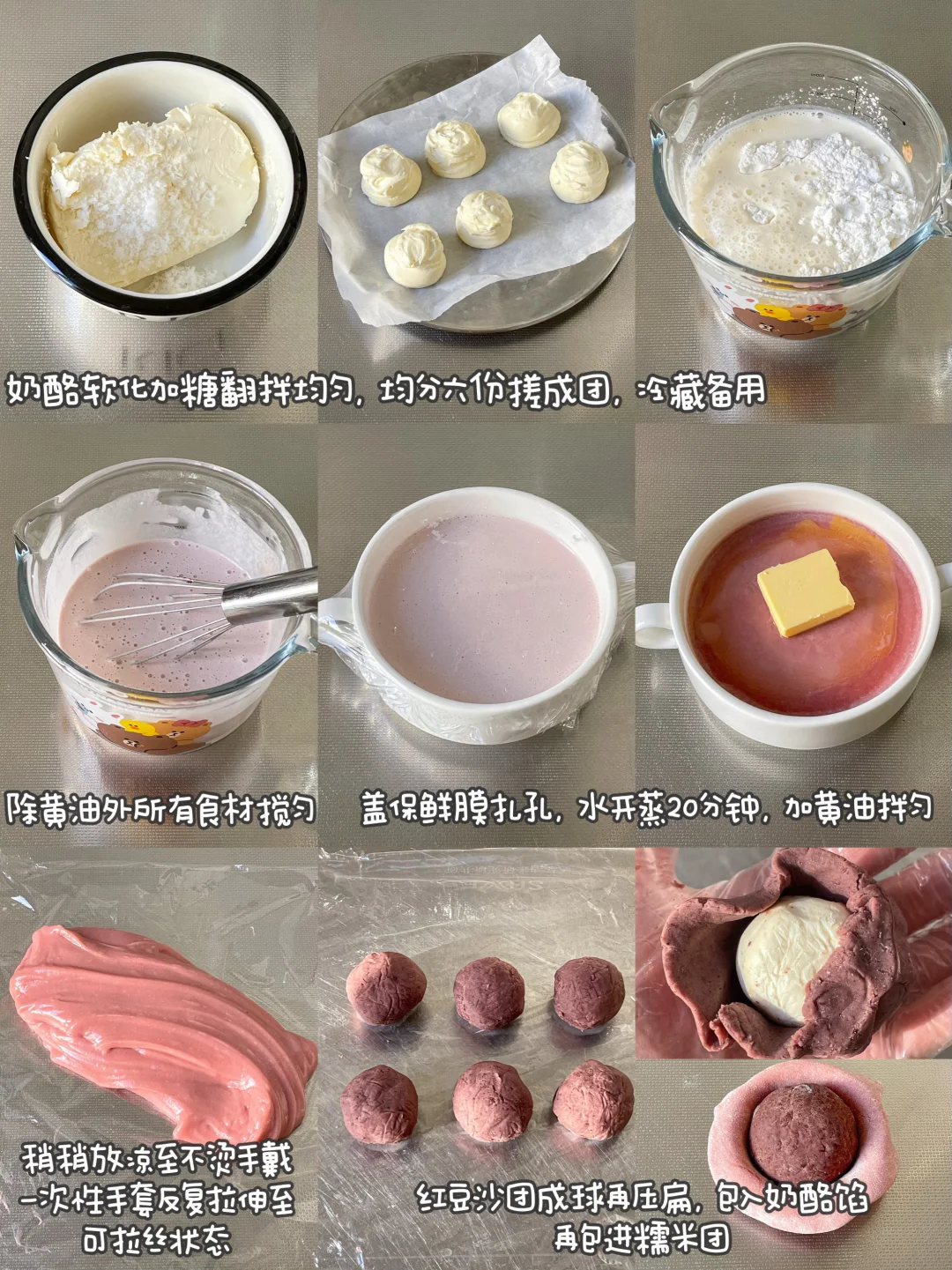 【糯米团】糯米粉100g|玉米淀粉20g|糖15g|牛奶160g|红曲粉适量|黄油10g