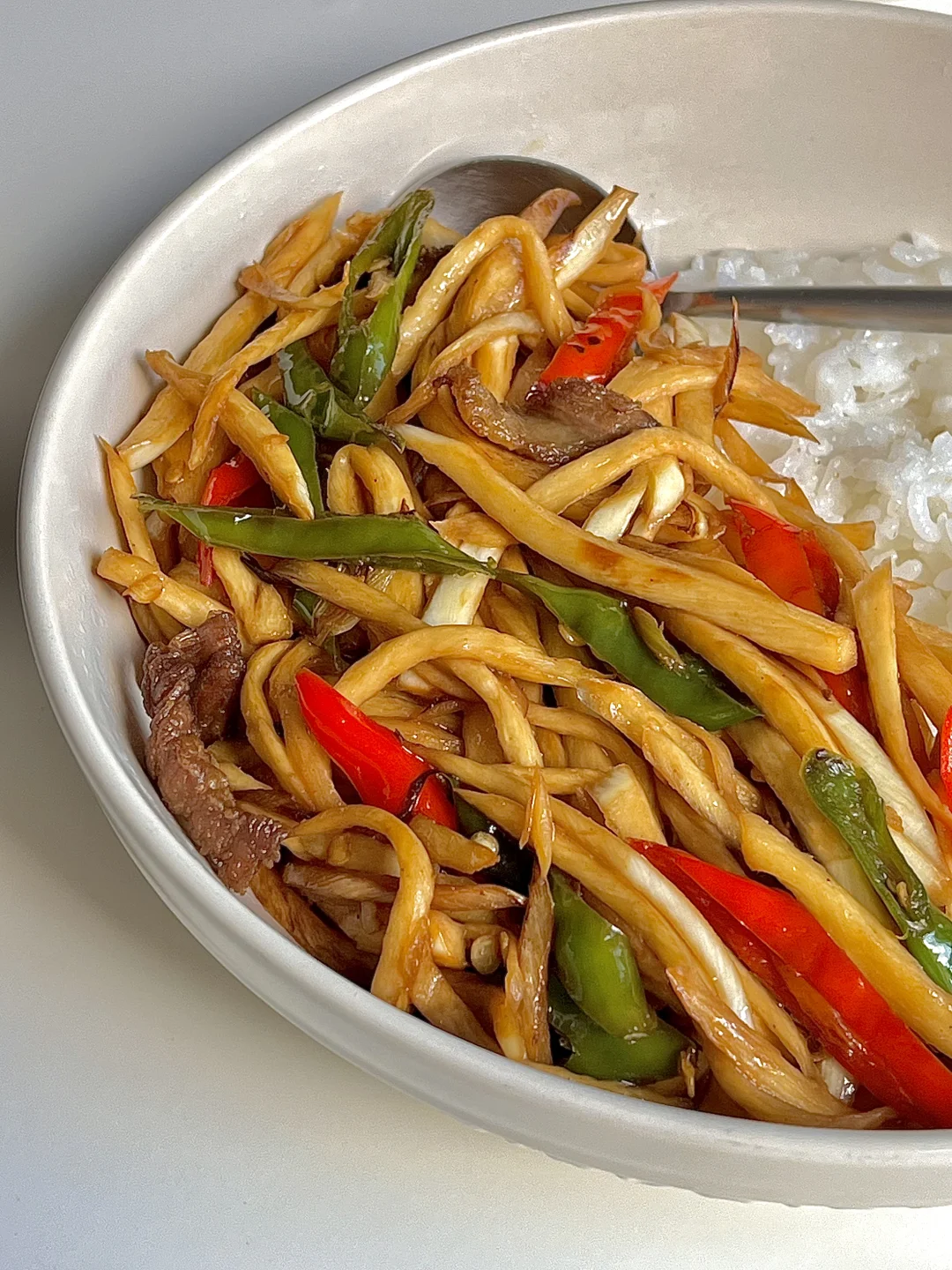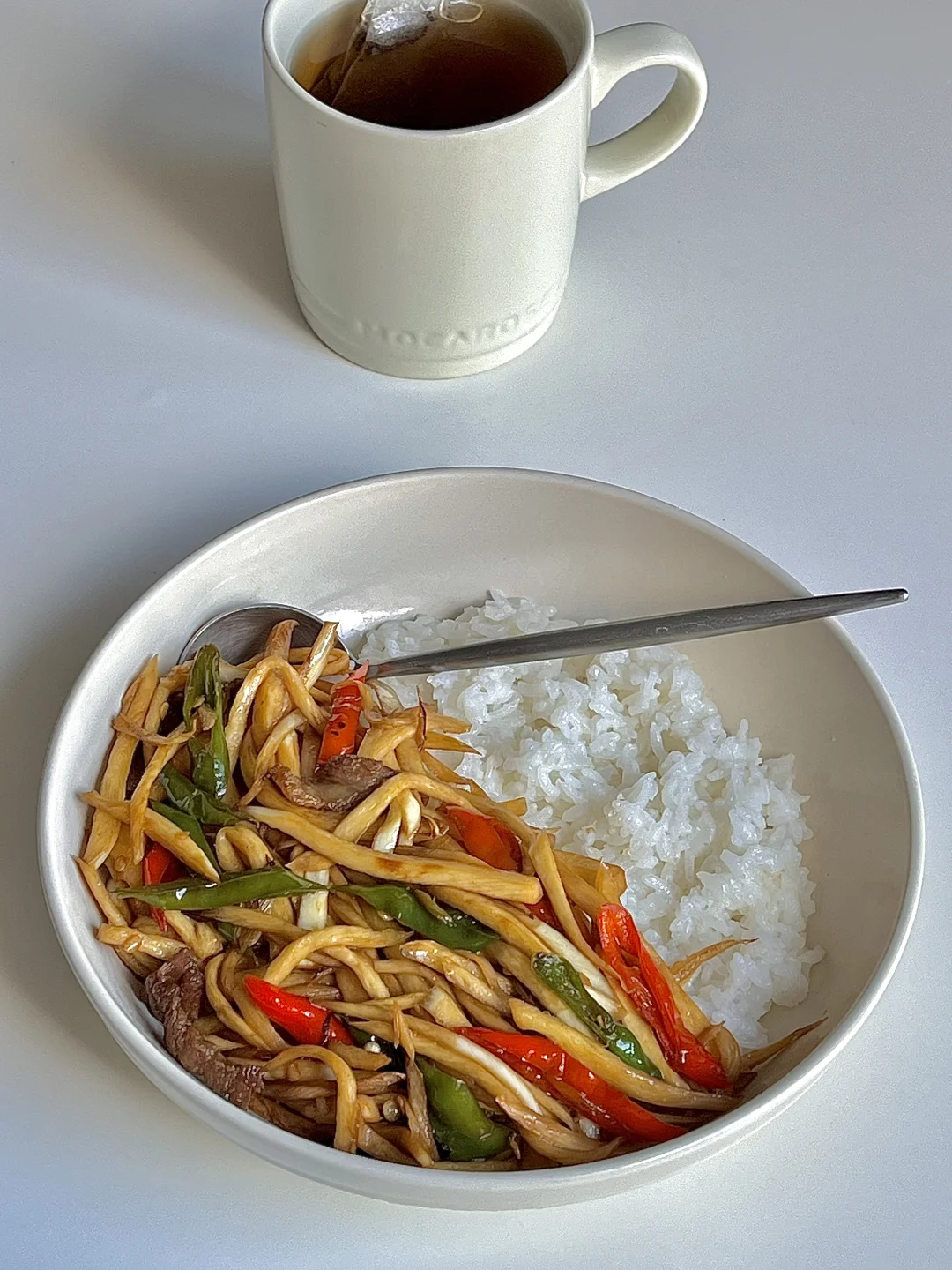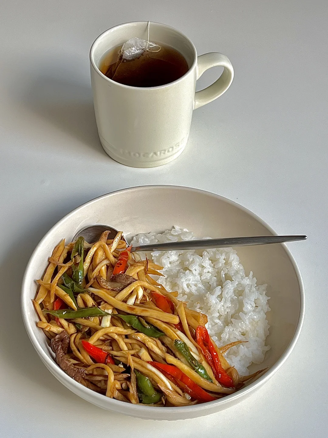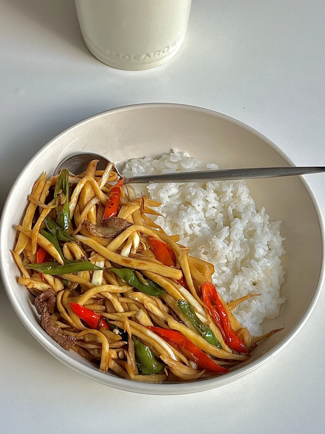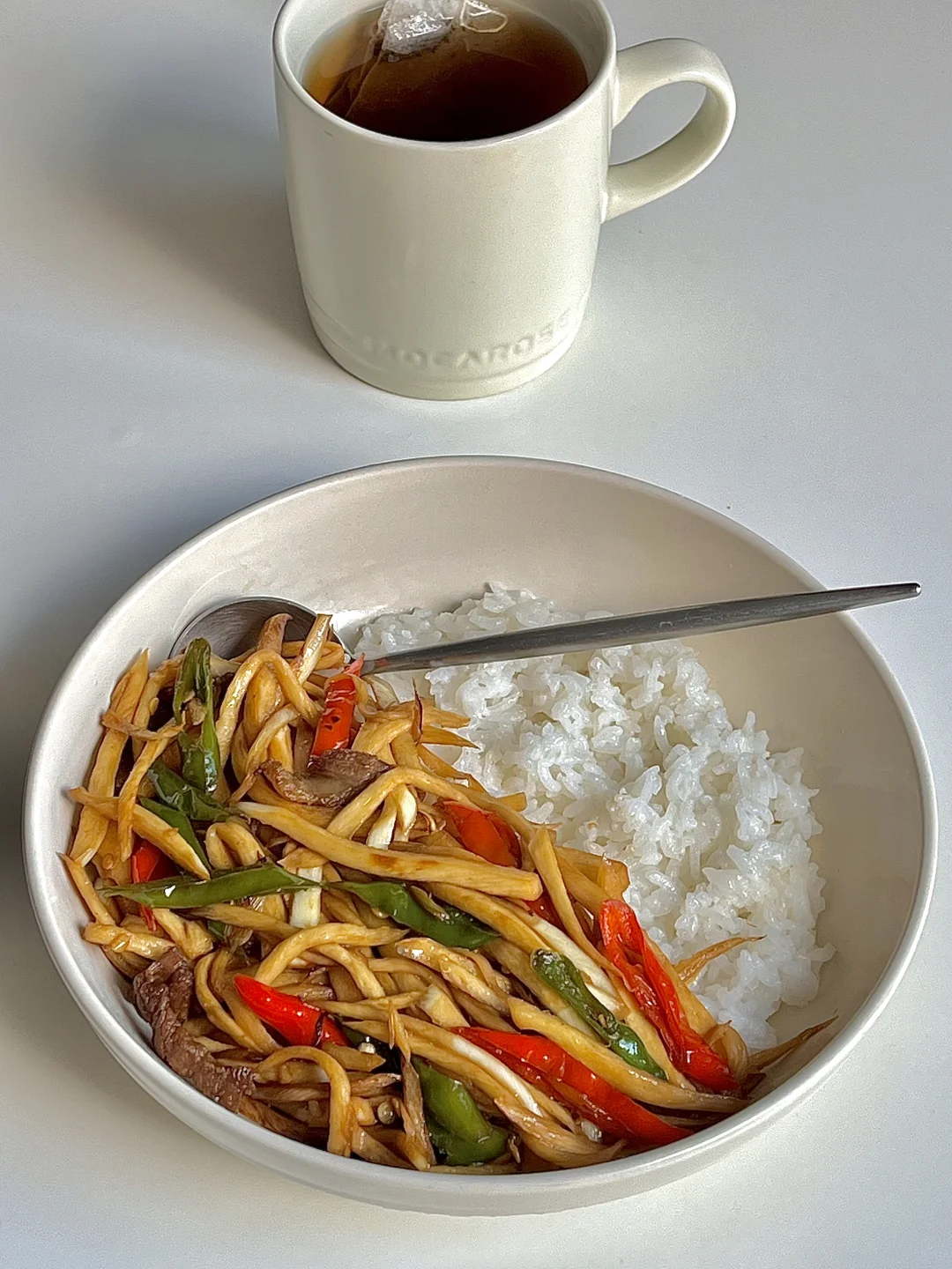 今日份一人食健康饮食分享: 茭白炒辣椒 白米饭🍚 红茶 . 食材:茭白 青红辣椒 葱蒜 干辣椒 肉丝 做法如图上⬆️ . 有没有人喜欢吃茭白啊 这样炒真的好吃又下饭,热量还不高 好吃爱吃😋