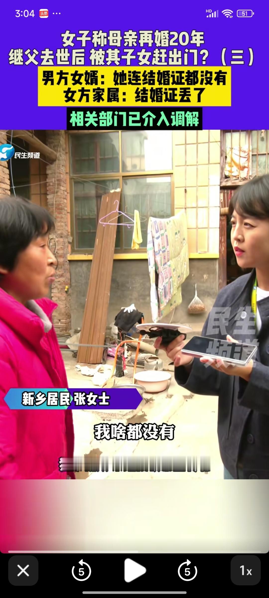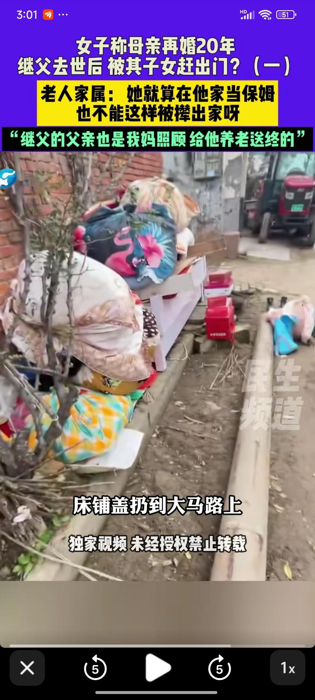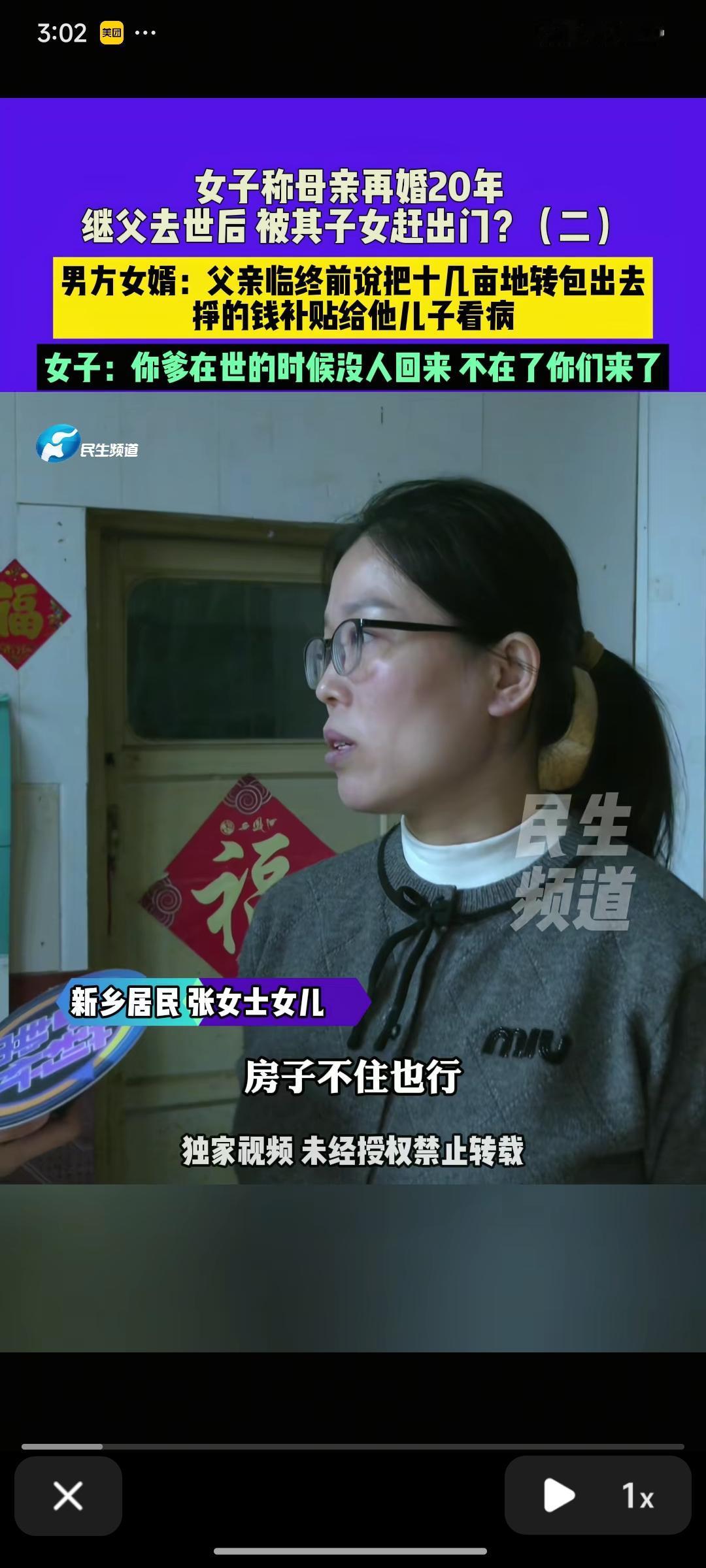 再婚二十载,丈夫患病离世。趁女子外出之际,继女悄无声息地将她的衣物尽数扔出家门,随后锁门离去。 丈夫育有一子一女。儿子远居内蒙古,正处中风康复阶段;女儿安家陕西。父亲患病后,儿子未出分文,女儿仅回来看望一次,给了2000元。 在自己女儿的协助下,女子带着丈夫前往城市医院医治,三年间花光了家中积蓄。 丈夫离世后,仅留下一套老房子和十几亩土地。 丈夫的子女要求女子离开这个家,理由是“你们没有结婚证,收回房子和土地是父亲的遗愿,卖了房子、出租土地,把钱留给生病的儿子”。 然而,这只是子女的一面之词,并无遗嘱为证。 女子回应道:“结婚证丢了,但我的户口已迁到你父亲名下,足以证明我们结过婚。” 最终,继女表示什么都不要。可继儿媳妇却称:“继母一天都不能住这房子,房子和土地都是我们的,一分都不会给她。” 女子嫁入这个家二十年,先后送走公公和丈夫,难道最终要落得一无所有的境地吗? 女子的女儿说:“我妈有地方住,我能赡养她。我帮母亲照顾继父,是出于情义。但他们这样对我妈,我很气愤。继父生病需要照顾、出钱的时候,他们人在哪里?我劝妈妈离开,可她就爱种地,没办法。” 的确,父亲生病需人伺候时,子女都不在身边;父亲去世争财产时,他们却现身了。 难道不该是谁尽孝谁受益吗?可法律不允许,最终还是有血缘关系的人拥有继承权。 农村的房子不值钱,土地归集体所有,但那房子和土地上,留存着她与丈夫二十年的美好回忆。 相关部门已介入调解,此事仍在协商之中。 十几亩土地一年出租能有一万多元收入,一套老屋又能值多少钱呢? 做人要懂得感恩,情意比金钱更值得珍惜。 来源:河南广播电视台民生频道