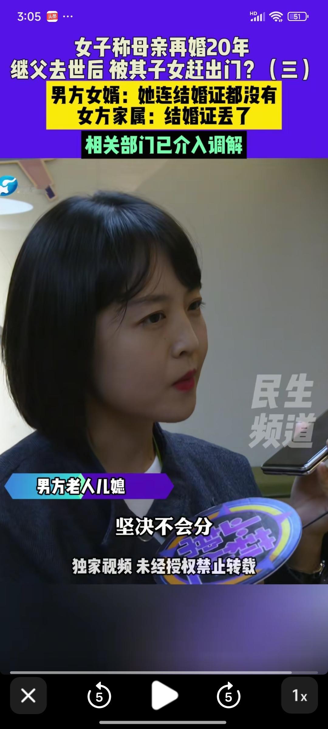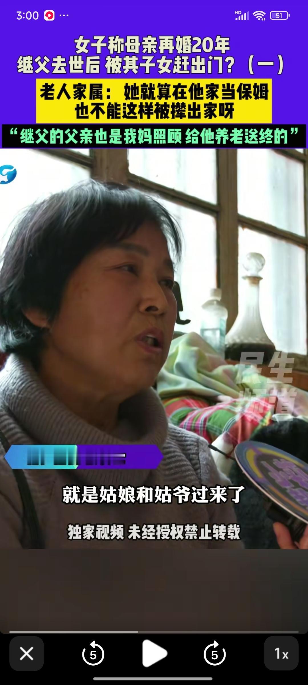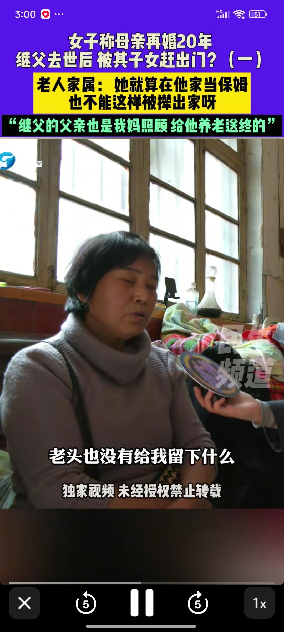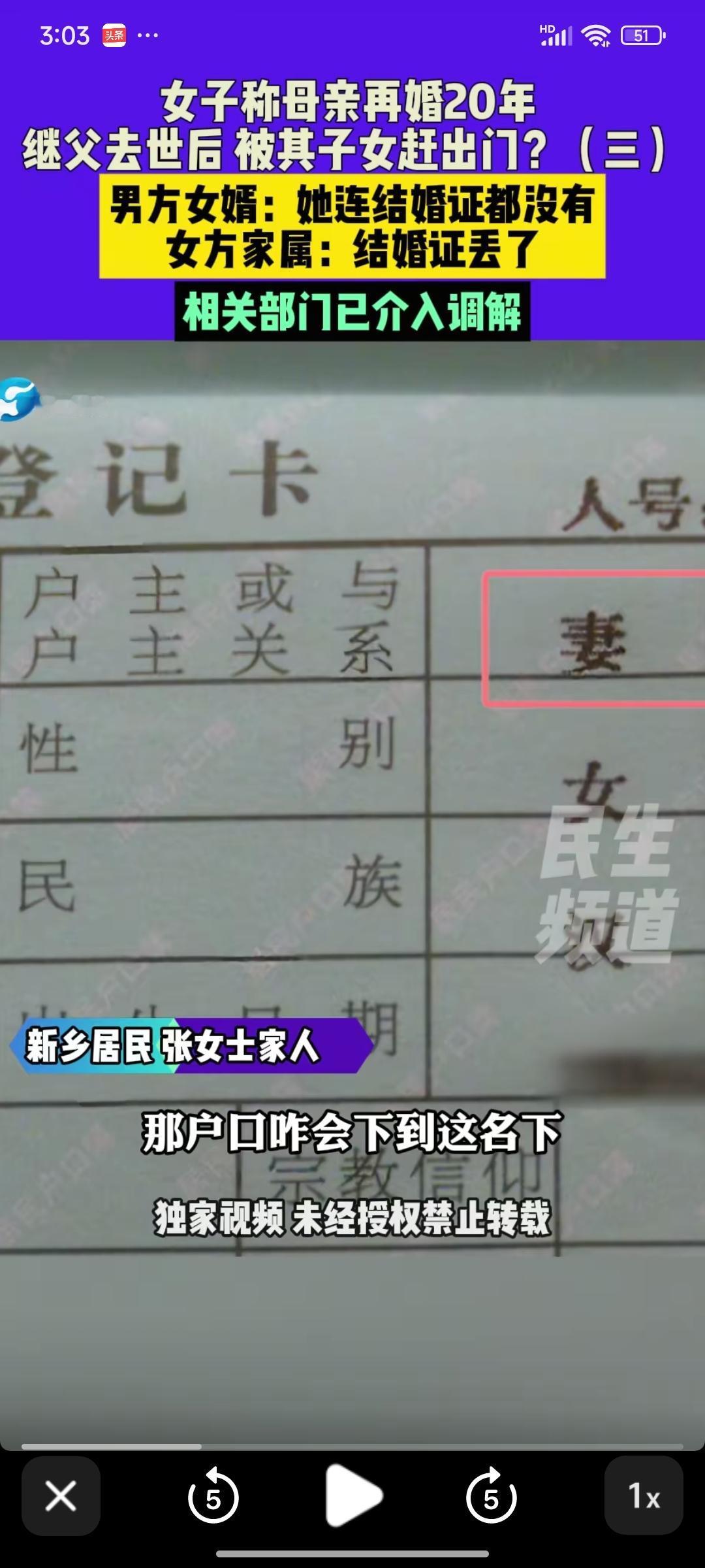 再婚二十载,丈夫患病离世。趁女子外出之际,继女悄无声息地将她的衣物尽数扔出家门,随后锁门离去。 丈夫育有一子一女。儿子远居内蒙古,正处中风康复阶段;女儿安家陕西。父亲患病后,儿子未出分文,女儿仅回来看望一次,给了2000元。 在自己女儿的协助下,女子带着丈夫前往城市医院医治,三年间花光了家中积蓄。 丈夫离世后,仅留下一套老房子和十几亩土地。 丈夫的子女要求女子离开这个家,理由是“你们没有结婚证,收回房子和土地是父亲的遗愿,卖了房子、出租土地,把钱留给生病的儿子”。 然而,这只是子女的一面之词,并无遗嘱为证。 女子回应道:“结婚证丢了,但我的户口已迁到你父亲名下,足以证明我们结过婚。” 最终,继女表示什么都不要。可继儿媳妇却称:“继母一天都不能住这房子,房子和土地都是我们的,一分都不会给她。” 女子嫁入这个家二十年,先后送走公公和丈夫,难道最终要落得一无所有的境地吗? 女子的女儿说:“我妈有地方住,我能赡养她。我帮母亲照顾继父,是出于情义。但他们这样对我妈,我很气愤。继父生病需要照顾、出钱的时候,他们人在哪里?我劝妈妈离开,可她就爱种地,没办法。” 的确,父亲生病需人伺候时,子女都不在身边;父亲去世争财产时,他们却现身了。 难道不该是谁尽孝谁受益吗?可法律不允许,最终还是有血缘关系的人拥有继承权。 农村的房子不值钱,土地归集体所有,但那房子和土地上,留存着她与丈夫二十年的美好回忆。 相关部门已介入调解,此事仍在协商之中。 十几亩土地一年出租能有一万多元收入,一套老屋又能值多少钱呢? 做人要懂得感恩,情意比金钱更值得珍惜。 来源:河南广播电视台民生频道