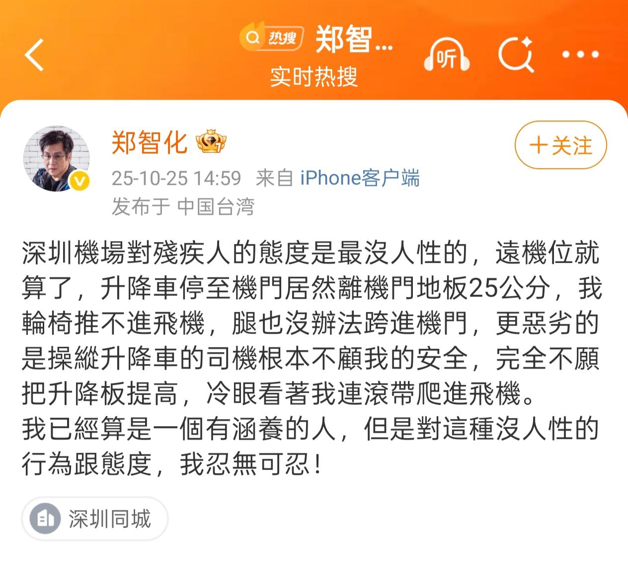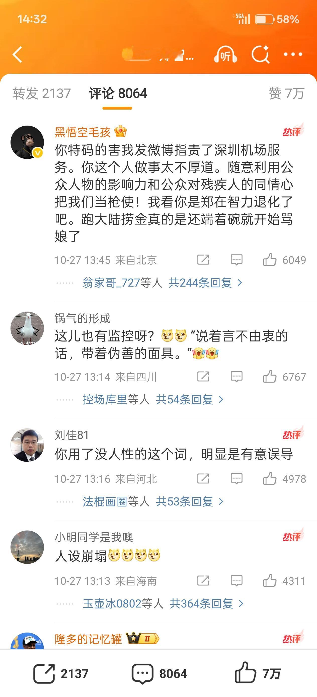 说着言不由衷的话,戴着伪善的面具。原来这歌词写的是郑智化自己?真是多年以后一场大雨惊醒沉睡的我! 经过一个周末的发酵,郑智化事件大反转,把深圳机场和全国很多机场怒喷一遍之后,监控视频狠狠打脸了。原来“连滚带爬”还能这样用的啊,原来“没人性”其实是“服务非常好”。 哗众取宠完了之后,您觉得一句“为我的用词道歉”够吗?这性质已经属于造谣了吧? 作为常年出入国内许多机场的人,我能感受到部分机场在服务细节方面确实有提升空间,但真不至于“没人性”、“刁难”、“恶意”。国内机场那么多从业人员的不懈努力,不允许被污名化。我相信,群众的眼睛是雪亮的。