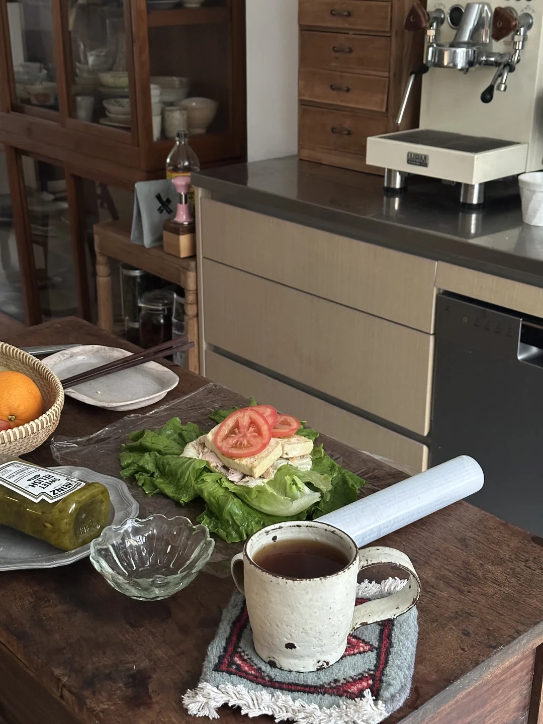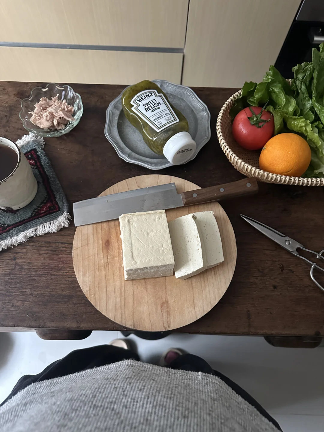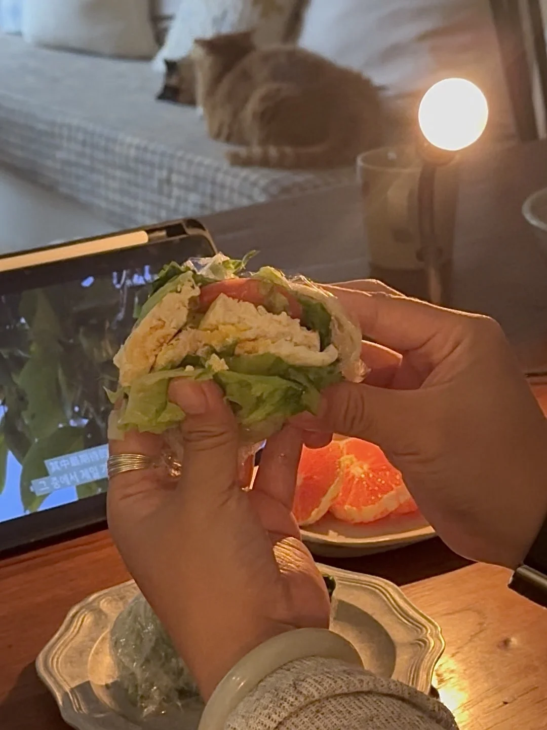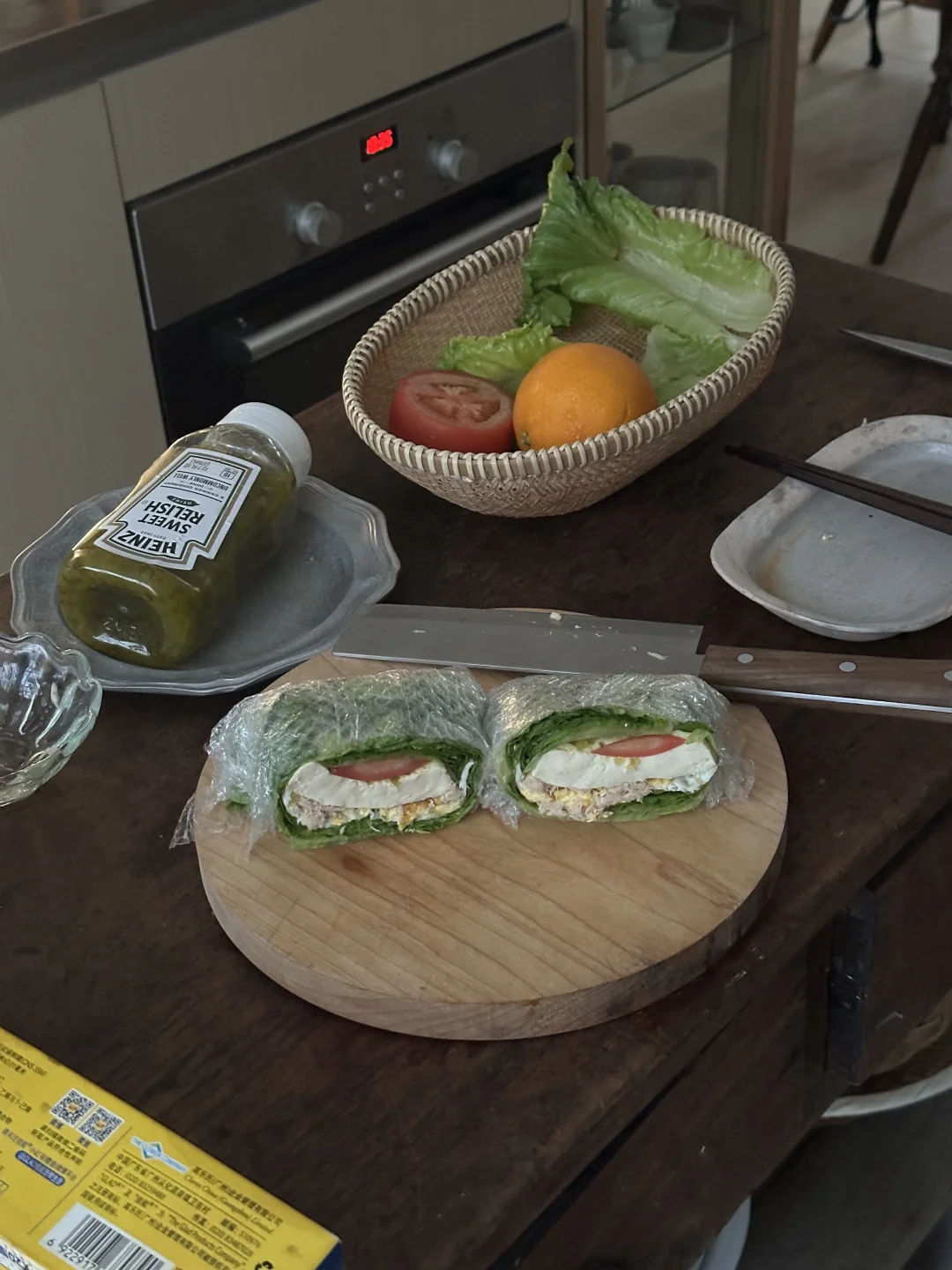 尝试了一下生菜三明治, 内馅我放了自己爱吃的烧豆腐、煎蛋、金枪鱼、西红柿和酸黄瓜酱 接连的下雨天家里阴凉阴凉的 有烧豆腐和煎蛋的加入,整个三明治也是热乎乎