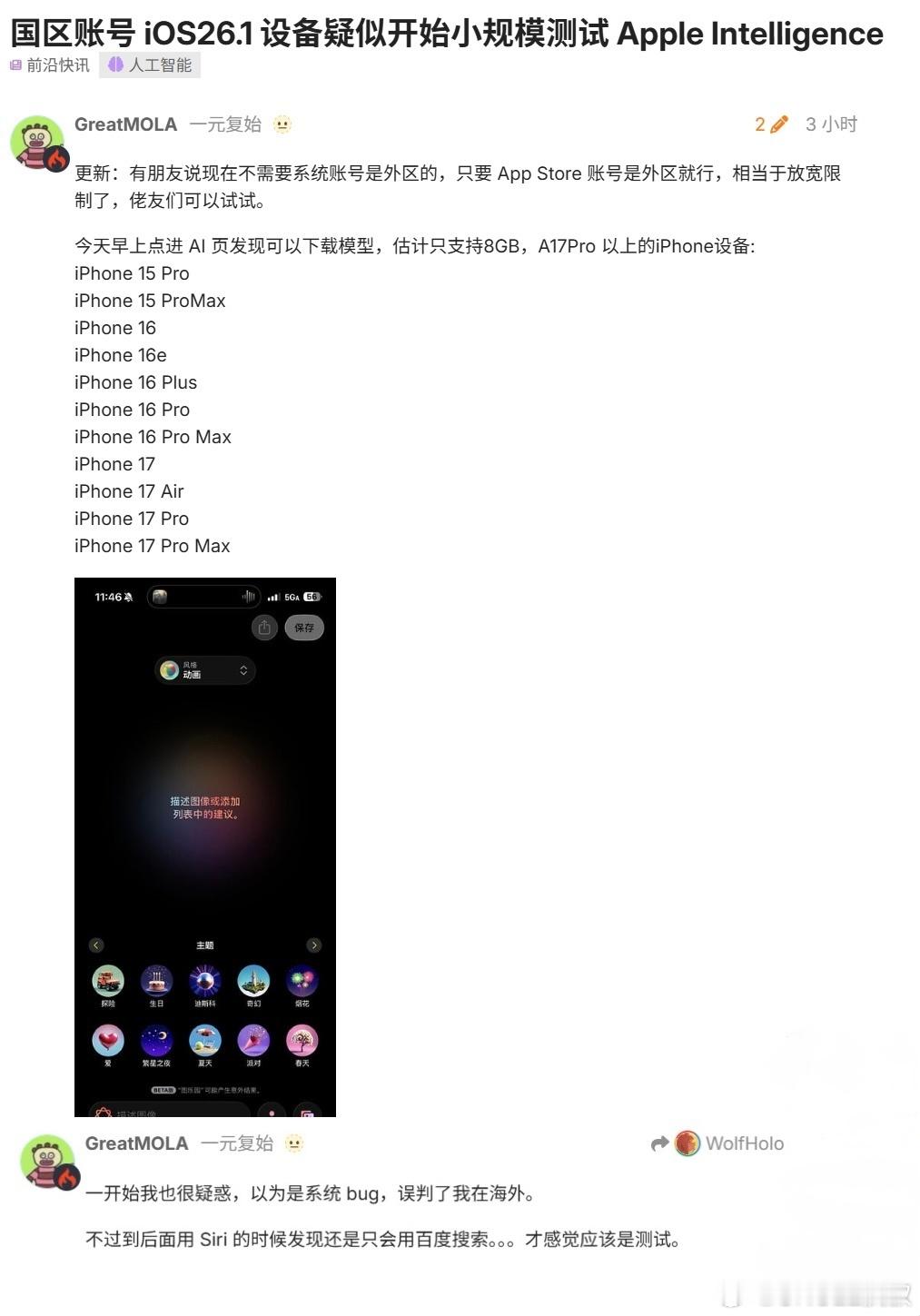 据传iOS 26.1Beta已经开始小范围测试国区Apple Intelligence了,有被选中的小伙伴没?从消息看Siri数据源由百度提供。