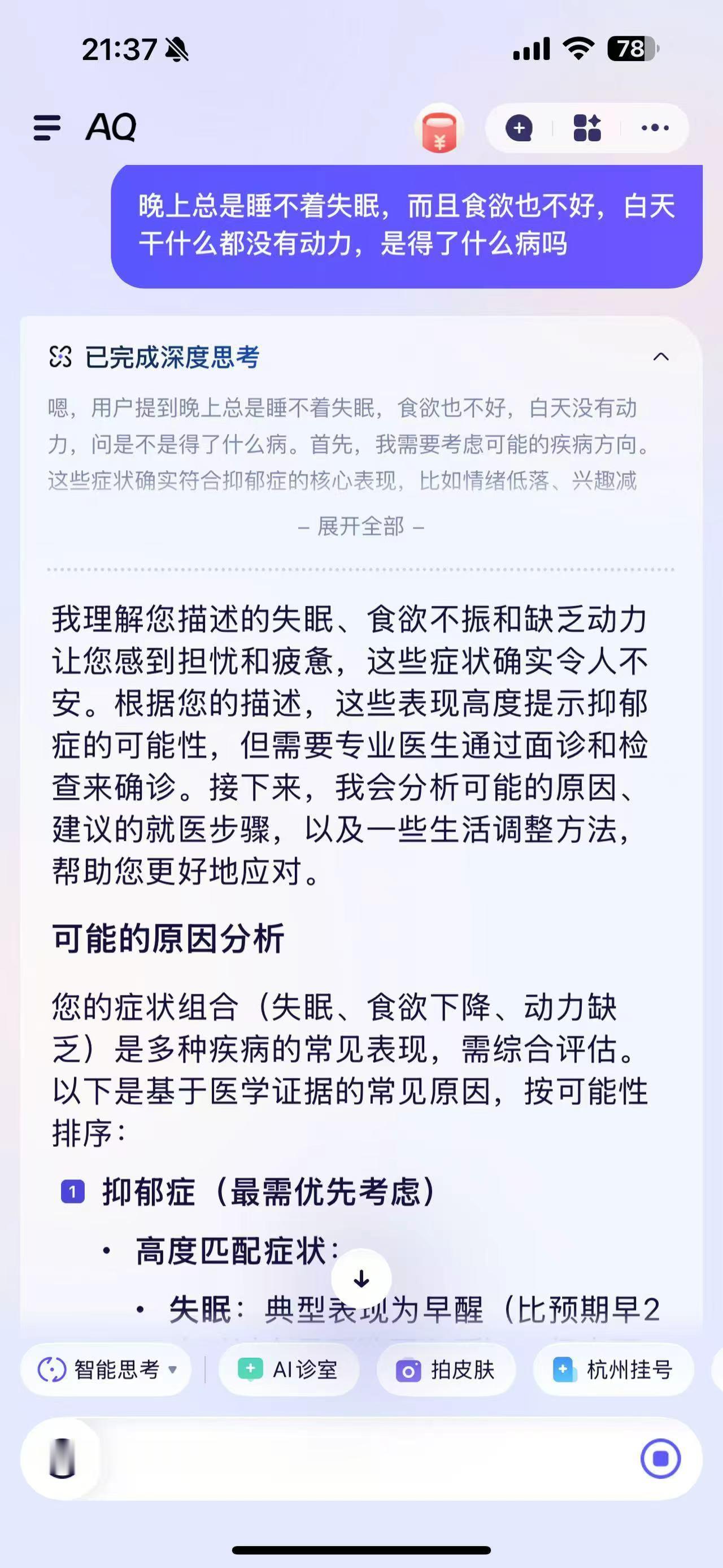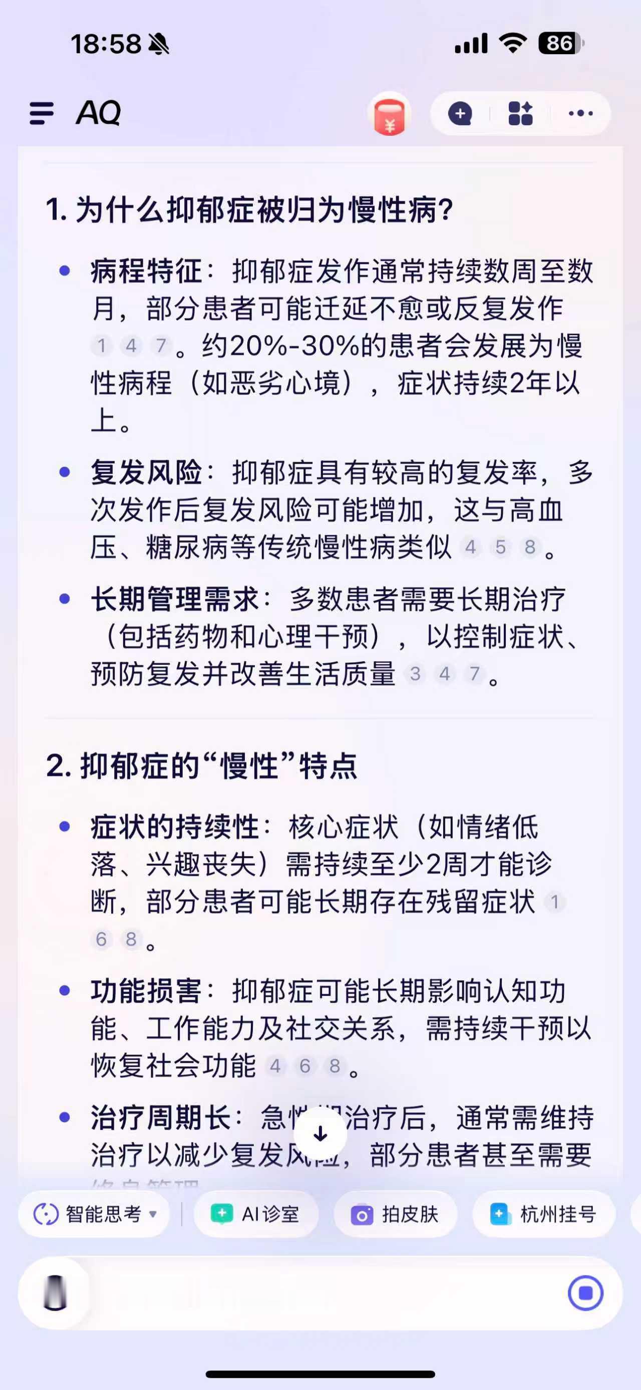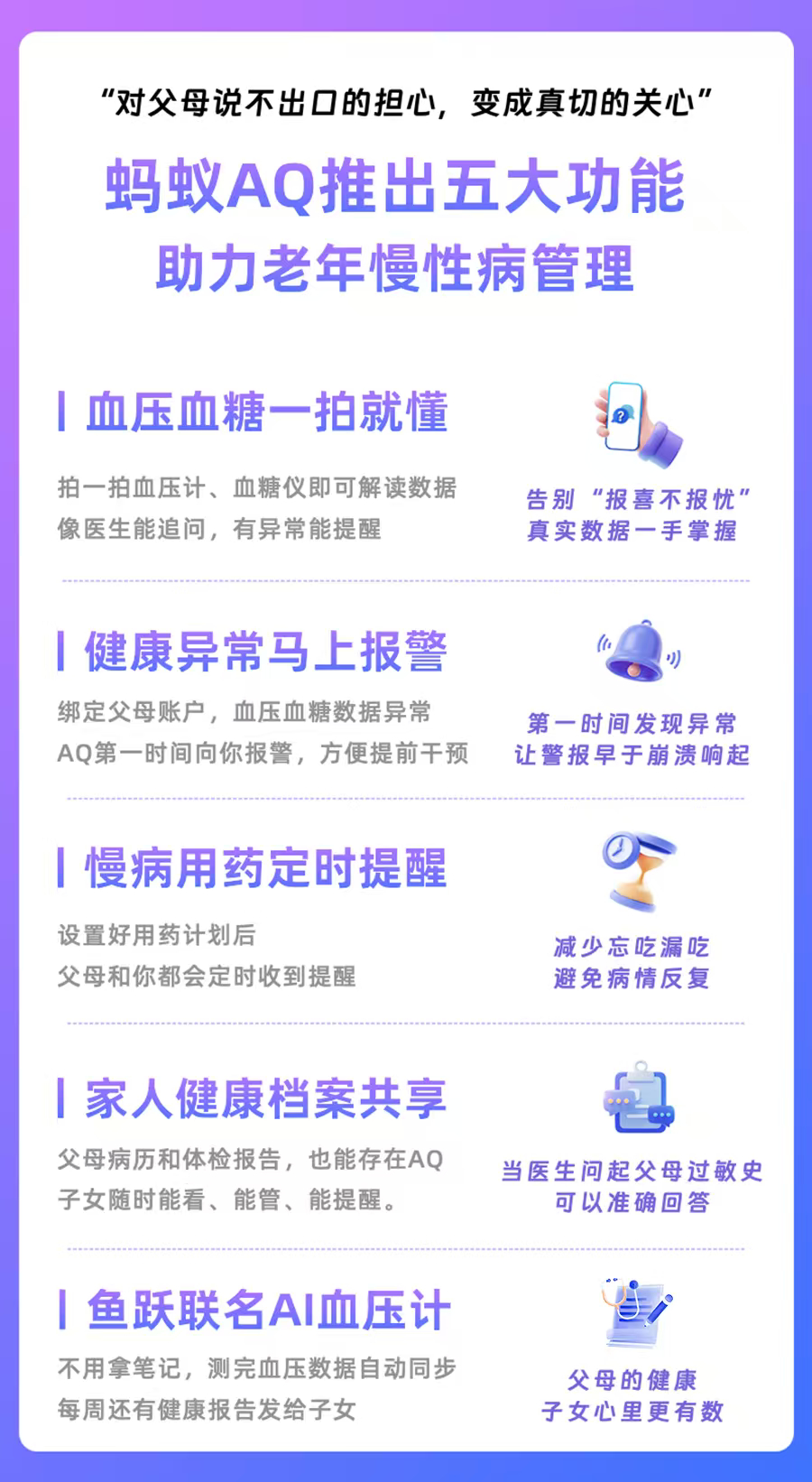 科技的发展,让AI也逐渐被大众所信任,我们可以在AI上咨询老人的症状是什么情况,比如用AQ拍一拍照片,再描述几句,就能知道高血压的情况,还能用AQ进行身体健康的事实监测和反馈!子女绑定账号后还能收到异常预警!最实用的就是定时用药提醒,再也不用担心会忘记了,就像有一个私人管家一样,做子女的也能省心不少!