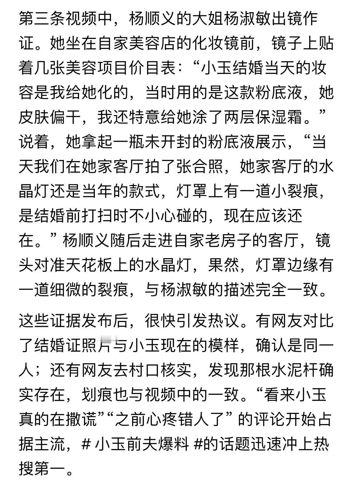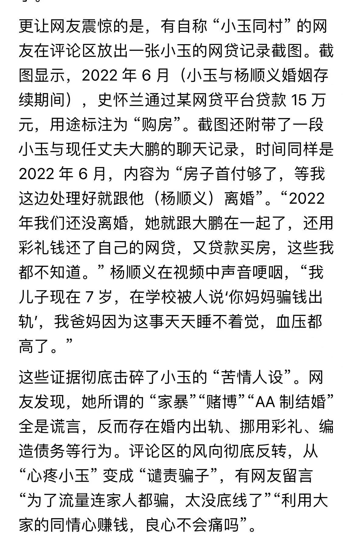 小玉风扇姐翻车了!前夫杨顺义揭露更多内幕,原来小玉根本不是什么抑郁症,欠网贷,而是满嘴谎话,婚内出轨的人。 表面上看她夹子音,娃娃脸,人畜无害,没想到私底下是个毒妇啊。 与前夫结婚就是为了骗与大鹏在苏州买房的首付钱。 得了便宜,还抹黑前夫。这人设不崩塌才怪。 人品堪忧,在互联网上怎么混?早晚会有被暴露的一天。 她千不该万不该为了打造苦情人设,抹黑前夫。 前夫老实,但不代表就能任他揉搓。