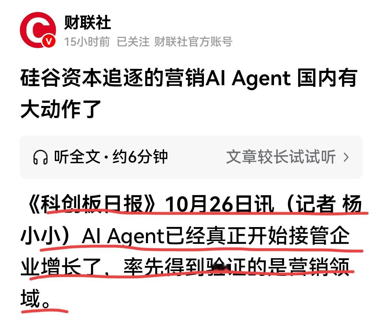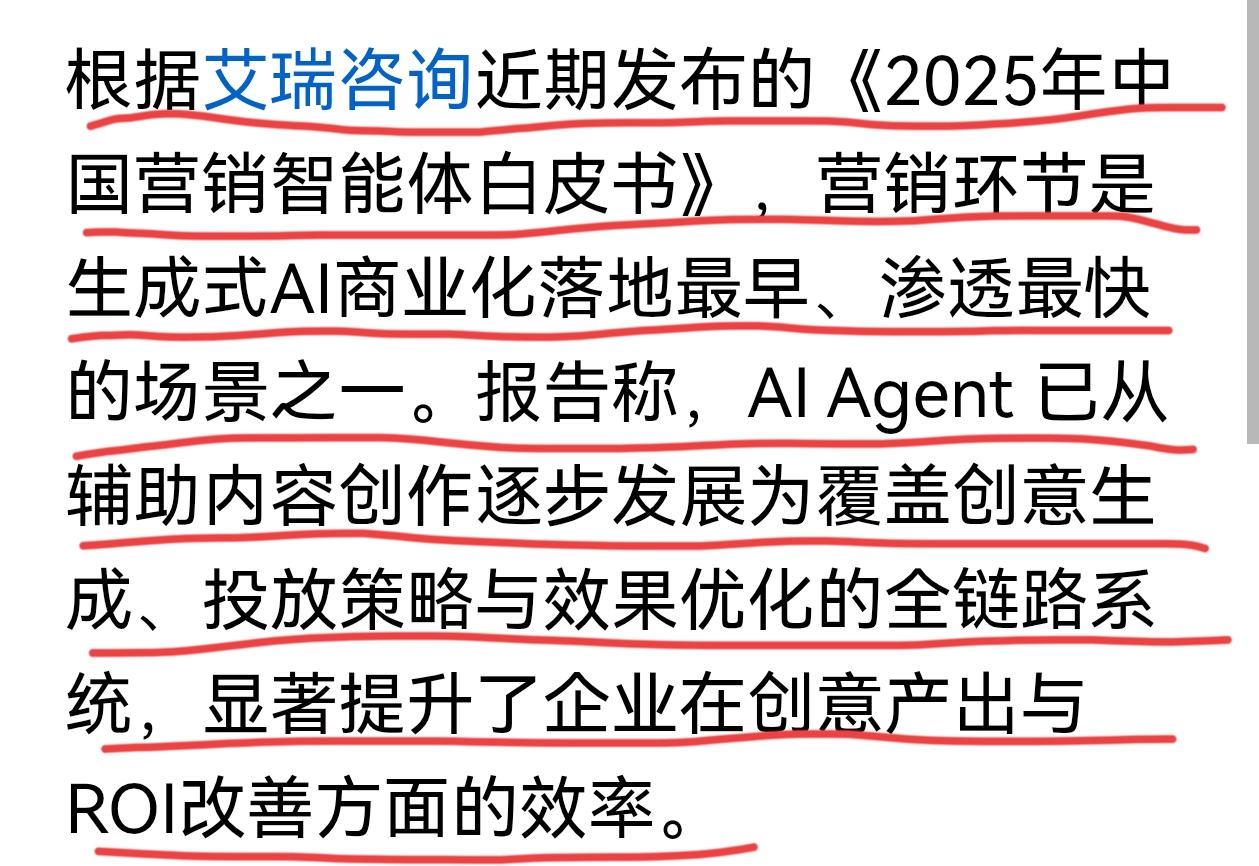 营销AI 智能体受硅谷资金追捧,其实美股市场上营销AI智能体表现也是很亮眼的,Applovin 在2024年大涨的基础上,2025年涨幅超120%了,瑞银将其目标价提高到了810美元。 营销环节是生成式AI商业化落地最早、渗透最快的场景之一。艾瑞咨询报告称,AI Agent 已从辅助内容创作,逐步发展成为覆盖创意生成、投放策略与效果优化的全链路系统。APPlovin 通过“AI+数字广告”模式实现了快速增长,二季度广告收入增长73%,社交巨头在AI广告领域的投资进一步验证了该模式的潜力。AI应用提升了投放广告的转换表现和投放效率,这标志着AI Agent 从工具阶段,迈入生产力基础设施时代。 随着美股营销AI智能体热度的提升,港股、A股中的AI广告概念股也有过一波行情。但A股AI投资方向主要集中在AI硬件——光模块、AI芯片等方面,AI应用端行情昙花一现。长远来看AI落地取决于应用,大部分的市场也在应用端,目前营销AI智能体率先商业应用,业绩兑现会逐步体现出来,美股相关个股受资金追捧,A股中 的“AI+数字广告”、“AI+数字营销”标的会有机会。