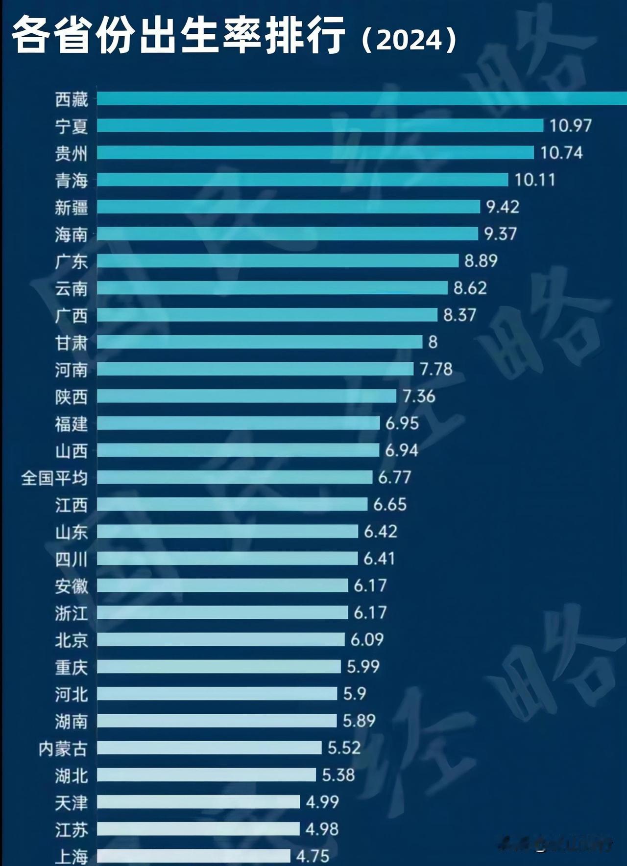 根据去年统计,全国出生人口954万人,相比上年回升52万人;出生率6.77‰,反弹0.38个千分点。 中国“最敢生”的地方出现了 近日《中国统计年鉴2025》揭示的全国生育版图,体现了全国人口出生率分布,正由广东与部分西部省份共同主导,这背后是人口结构、地域文化与经济流动共同作用的结果。 一方面,广东成为了经济发达省份中的“独苗”。其以8.89‰的出生率位居全国第七,并以113万的出生人口蝉联榜首,占全国约11.8% 的新生儿。这与它拥有大量年轻的外来人口流入密切相关,优化了人口年龄结构,使其在发达经济体中保持了可观的生育活力。 另一方面,西藏、宁夏、贵州、青海等西部省份,虽然人口基数不大,但凭借超过10‰的高出生率,在生育率榜单上名列前茅。它们与广东共同构成了稳定全国生育大盘的重要力量。 形成鲜明对比的是,以上海、江苏、天津为代表的发达地区及东北三省,出生率已降至5‰以下。特别是东北地区,人口自然减少与流失问题叠加,使其生育形势尤为严峻。 当前中国“最敢生”的版图呈现出一种二元结构:由广东代表的,依靠年轻人口流入支撑的经济高地;以及由西部省份代表的,受生育文化与传统影响的传统高地。 这一格局凸显了刺激生育需采取差异化策略,在鼓励生育的同时,如何优化人口结构、促进区域平衡,是更深层次的挑战。 【注】图片及参考信息来源 国民经略
