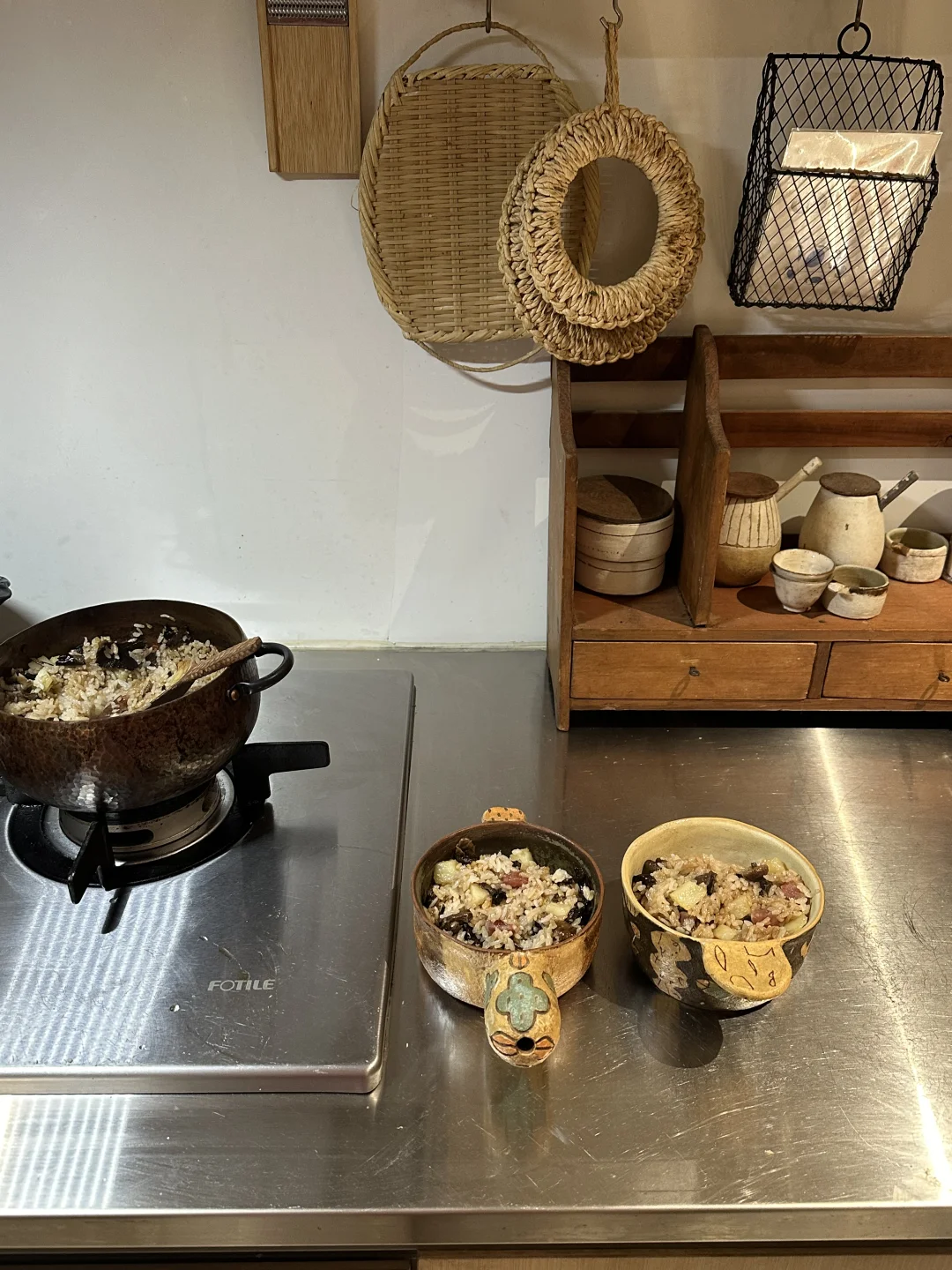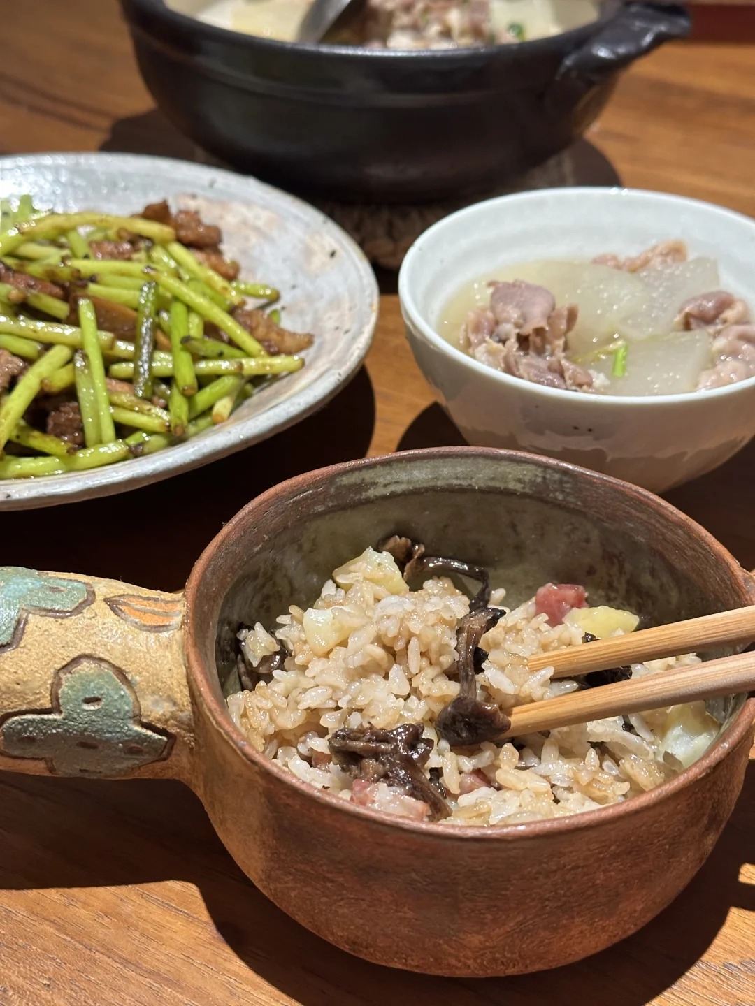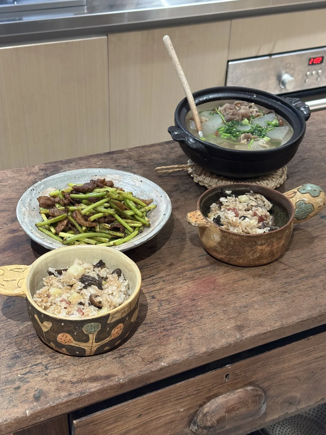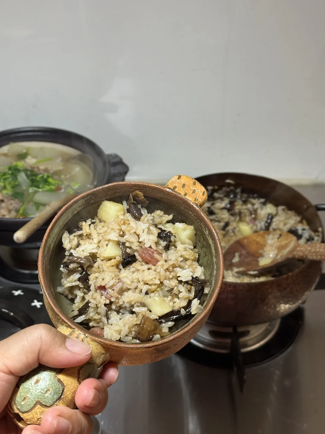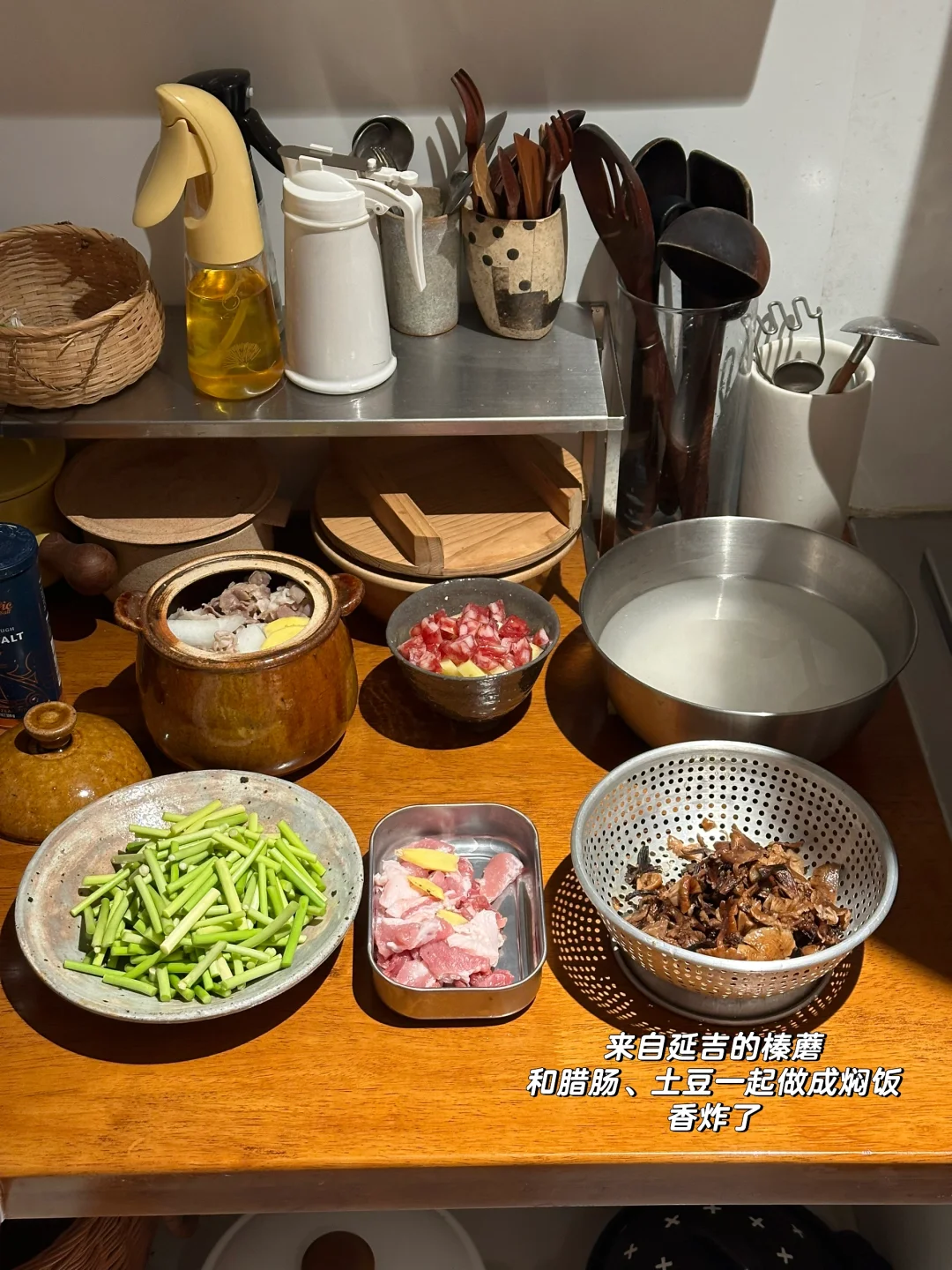 晚上做了榛蘑土豆腊肠焖饭 用铜锅焖饭有种格外的香气,锅巴更脆 冬瓜羊肉汤是降温之后的必备 蒜苔炒肉这种下饭菜是家常的美味 附榛蘑土豆腊肠焖饭做法: 大米提前浸泡20分钟,和比平时蒸米饭少一点的水量一起放进铜锅 榛蘑洗净泡发,腊肠土豆切丁 葱花和花椒面爆香,下榛蘑翻炒,等榛蘑水分炒干下腊肠和土豆丁,加盐和酱油调味 炒至腊肠白色部分变透明就可以放进装有大米的铜锅,翻拌一下,开盖开大火,水开之后转文火,盖盖子焖煮,水收干之后持续文火5分钟左右关火