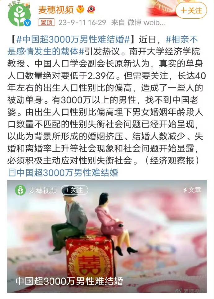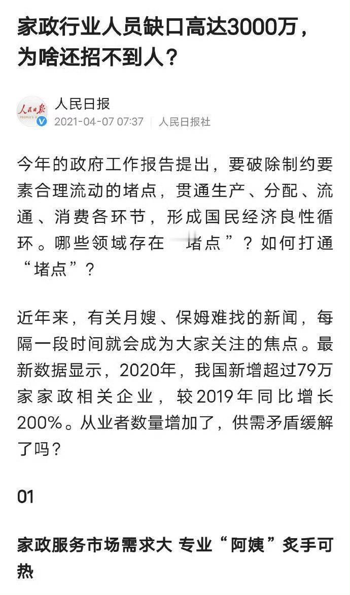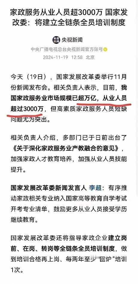 为什么都是三千万?中国男比女多三千万,家政行业缺口三千万,家政行业从业人员也是三千万,今天又说中国的三岁以下婴幼儿数量是三千万。 “中国男比女多三千万”这个传言少说也有二十年了,2023年居然得到了半官方的认证。2021年人民日报说家政服务人员缺口三千万,三年后,2024年,央视说家政行业从业人员数量是三千万。