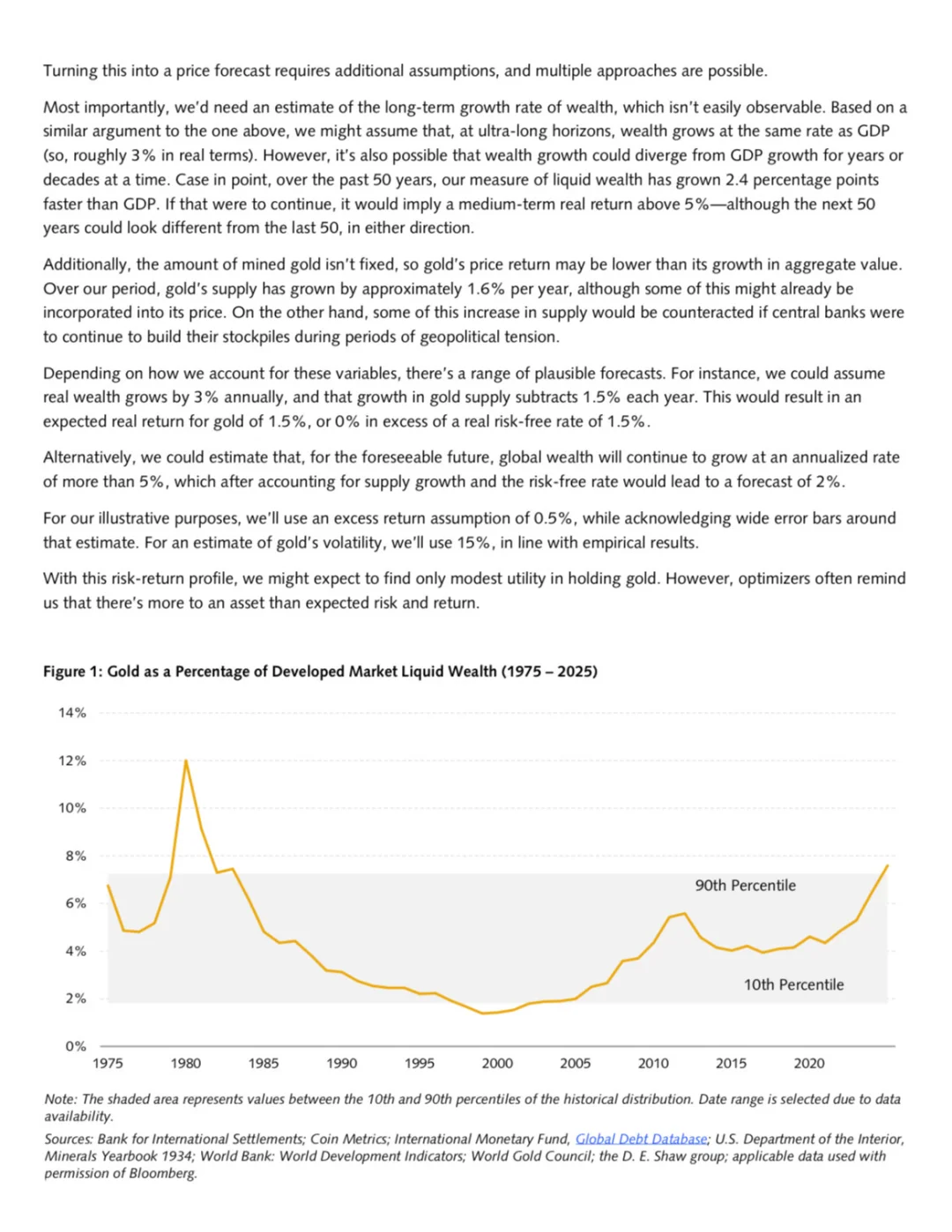 4. 黄金预期回报需平衡“财富增长红利”与“供给稀释”:按财富年增3%、黄金年供给增1.5%估算,实际回报约1.5%;研究为保守分析,取0.5%超额回报(超无风险利率)、15%波动率。