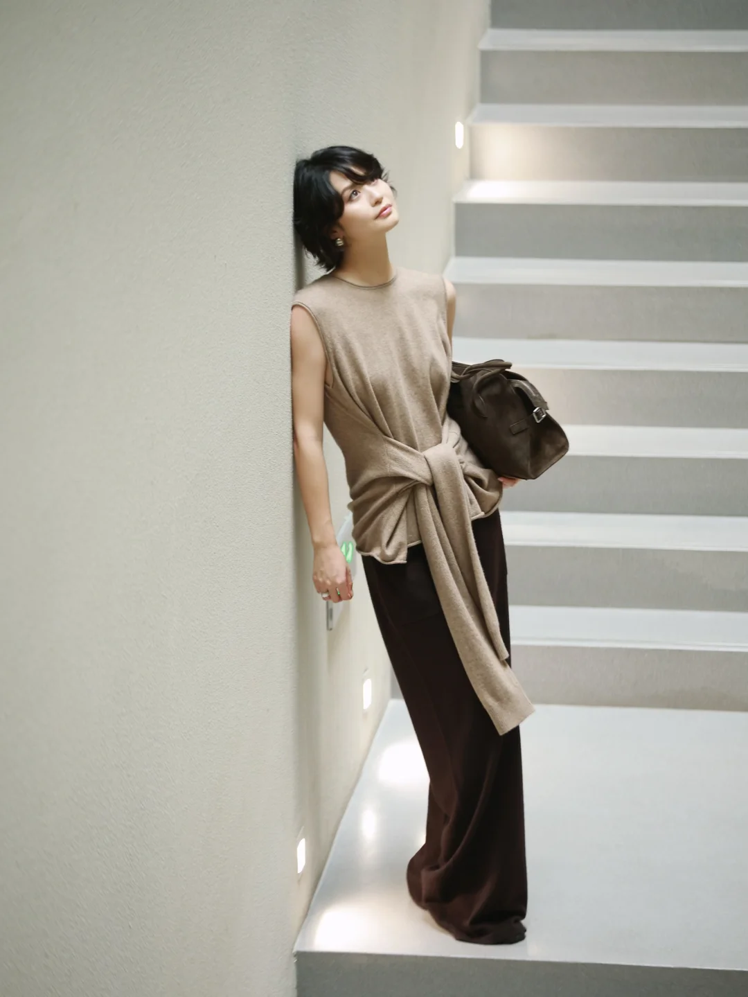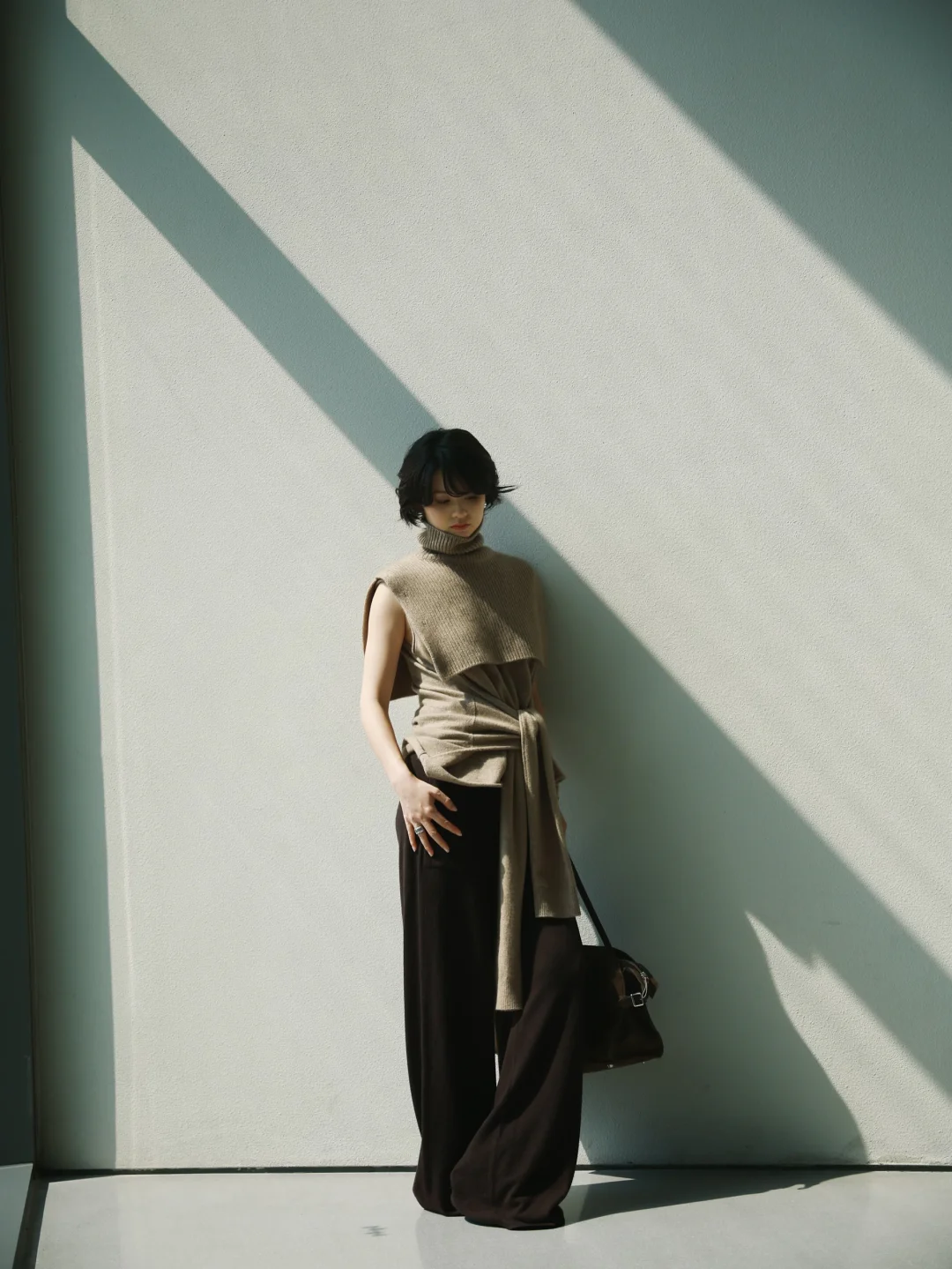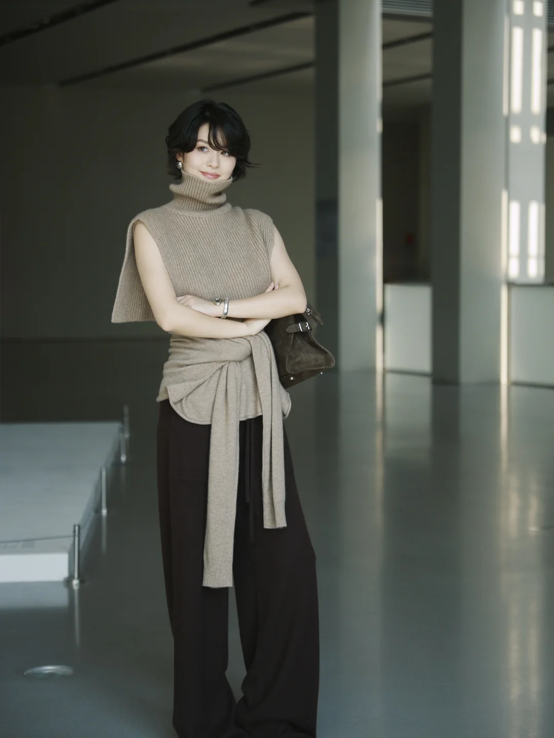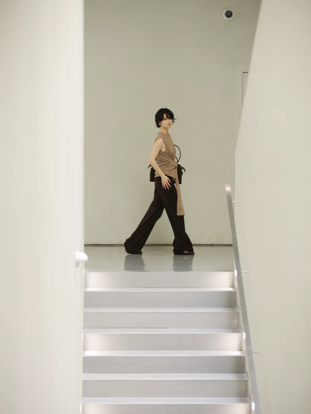 不对称的层叠结构,上身丝毫不显刻意,反而让身体与衣物之间有了自在游走的余地。正是这些“灵光一现的不完美”,成了专属于我的独特轨迹,也深深呼应了Uma Wang那句“容纳意外,拥抱偶然”的美学内核。面料依旧是1436引以为傲的小山羊绒,但这次被注入了更洒脱的灵魂——它不再是单一的软糯,而是拥有了自己的风骨,柔软之余,筋骨分明