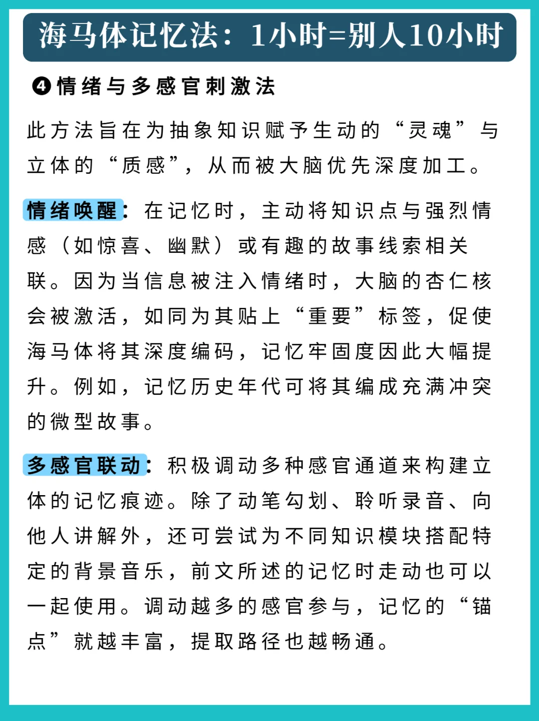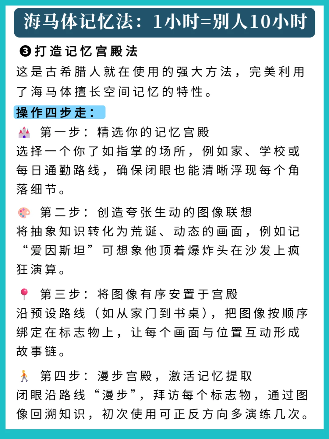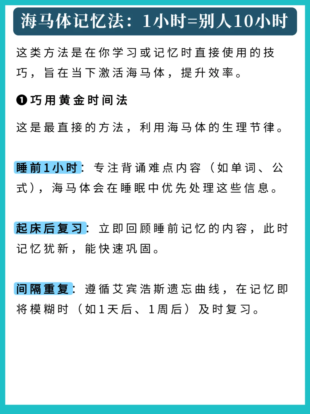 这类方法是在你学习或记忆时直接使用的技巧,旨在当下激活海马体,提升效率。