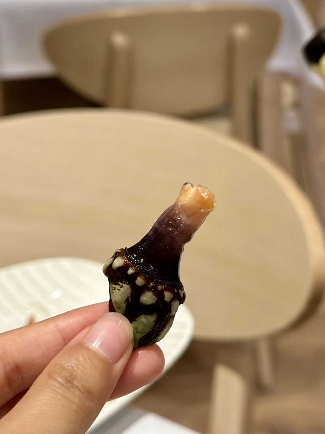 鬼爪螺其实是生长在海浪最猛烈岩石上的贝类,每一只都是渔民冒着被海浪拍下去的风险去采的。高端的食材,仅需要简单的烹饪。白灼一下就送上来了。特地请教了一下服务员食用方法。他解释说,拽着壳的两端,往下掰断(千万别往上,因为汁水很多,容易糊一身)。壳里包着嫩嫩的肉,一咬开是那种纯粹的海味,有一点咸、有一点甜、还有股热烈的海风气息。真的是我目前吃到的贝壳类的巅峰口感和鲜美了!