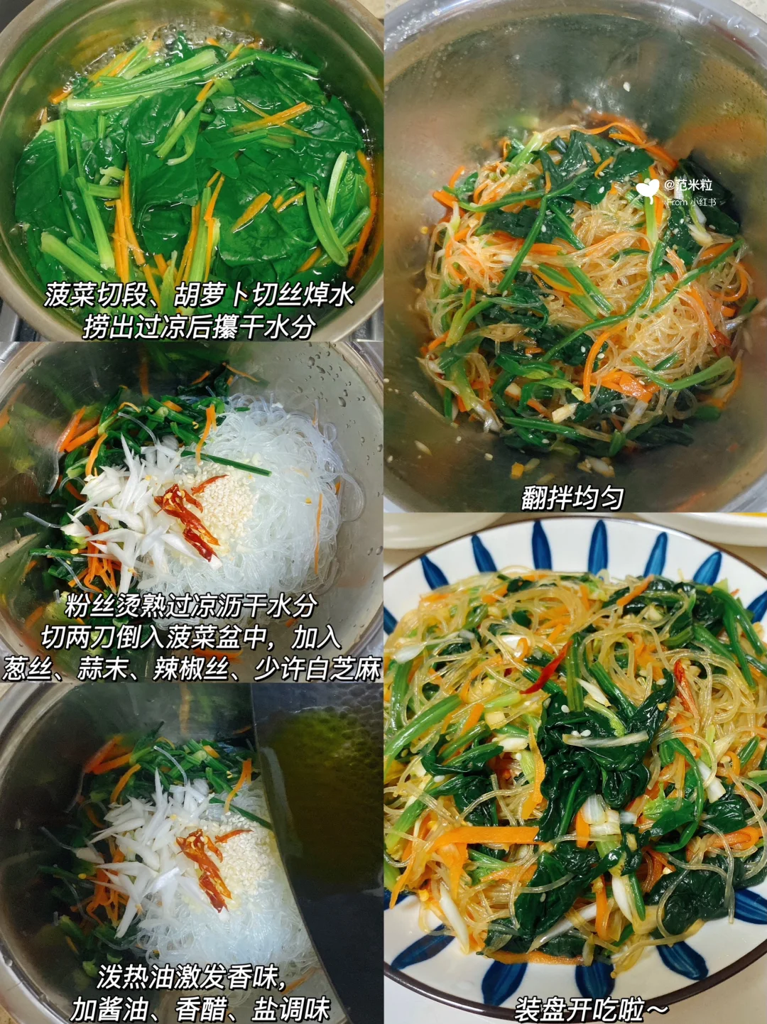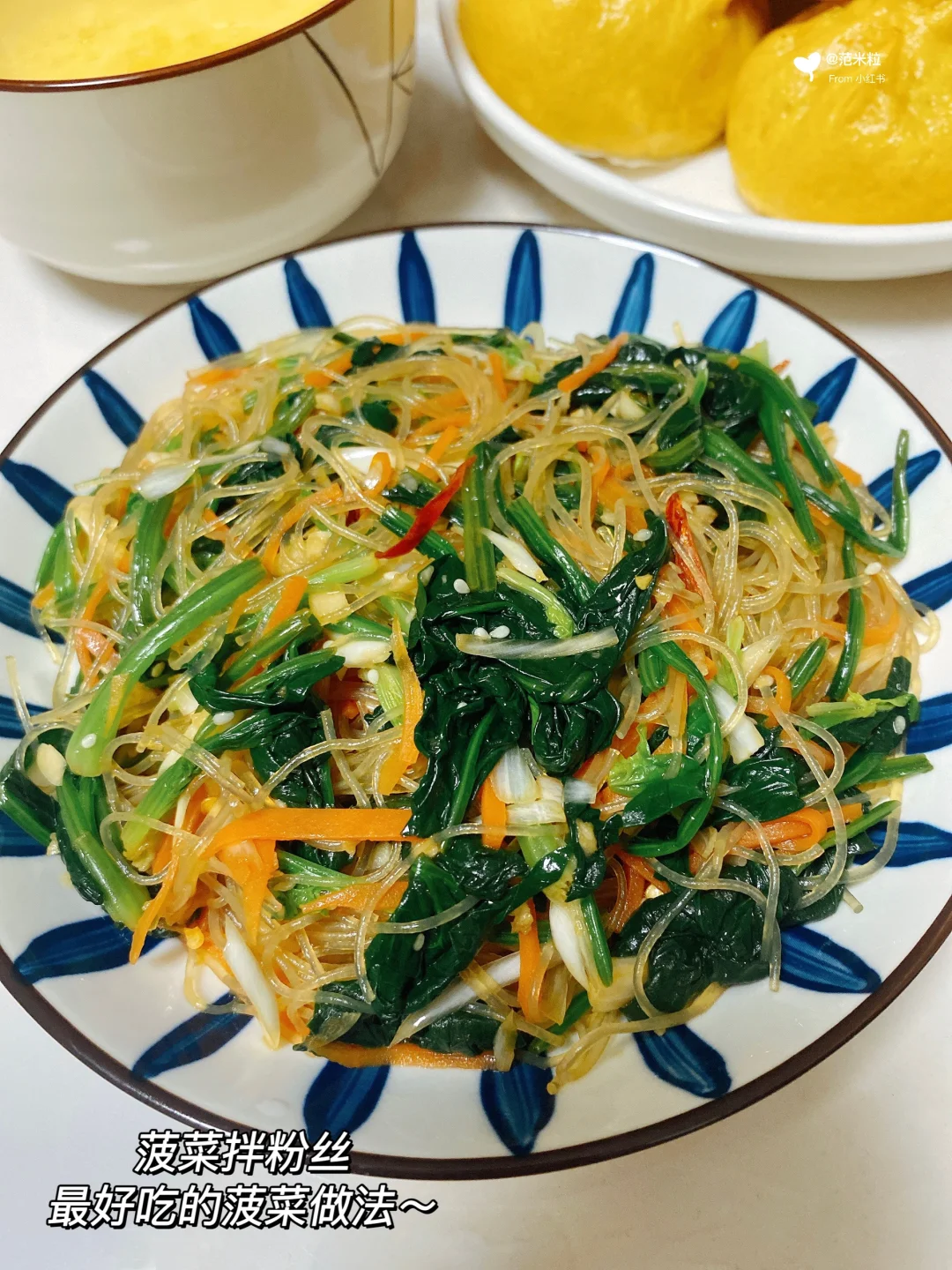 1、菠菜切段、胡萝卜切丝焯水过凉后攥干水分倒入盆中;粉丝烫熟过凉沥干水分切两刀倒入盆中,加入葱丝、蒜末、辣椒丝、少许白芝麻,泼热油激发香味,加酱油、香醋、盐、香油调味翻拌均匀装盘即可