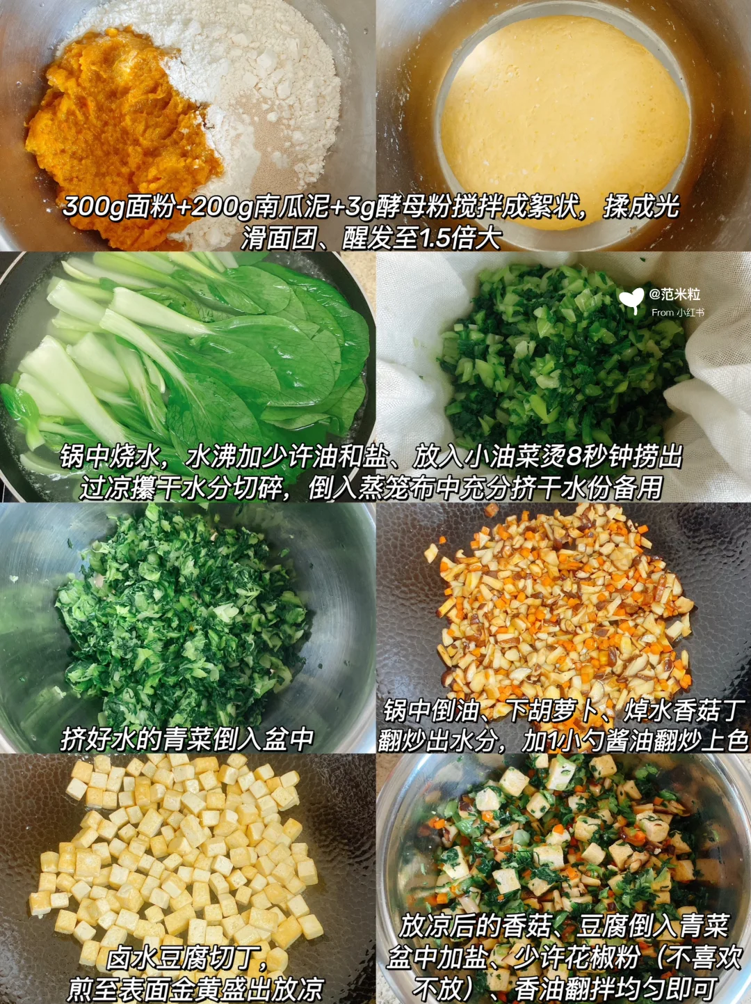 2、锅中烧水加少许盐和油下小油菜烫8秒钟捞出过凉攥干水分切碎,再倒入蒸笼布上充分挤干水分倒入盆中备用;热锅凉油,下胡萝卜、焯水香菇丁炒出水分,加1小勺酱油翻炒上色盛出晾凉;卤水豆腐切丁煎至表面金黄盛出晾凉备用