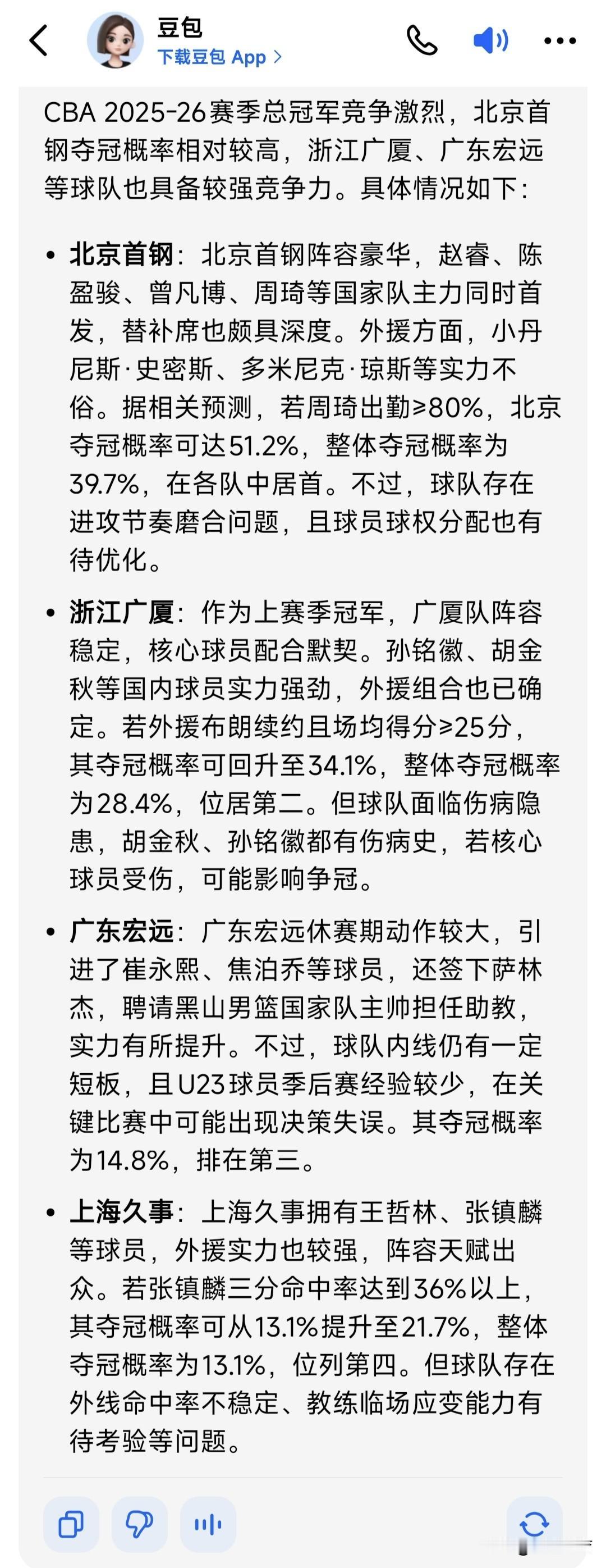 让豆包来预测一下25-26赛季,CBA总冠军的归属,四支球队获得提名,竟然没有辽宁队? 这四支球队分别是,引进了赵睿的北京队,保留夺冠阵容的浙江广厦,还有补强了崔永熙、焦泊乔的广东队和签下了张镇麟的上海队。 就纸面实力来看,豆包的预测和不少球迷的预测都是一致的。 而辽宁队作为CBA曾经的豪强球队,这次竟然连预测名单都入选不了,也是有些唏嘘,不过,这也是改变不了的事实,郭艾伦出走、张镇麟南下上海,韩德君退役,都标志着属于辽宁队的时代已经过去了。