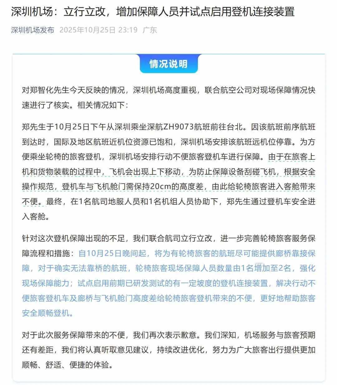 郑智化致歉 就此前称在深圳机场“连滚带爬”登机致歉,坦言是气愤下的不当遣词,感谢服务人员搀扶相助,更称事件引发对少数群体的关注更有意义 。