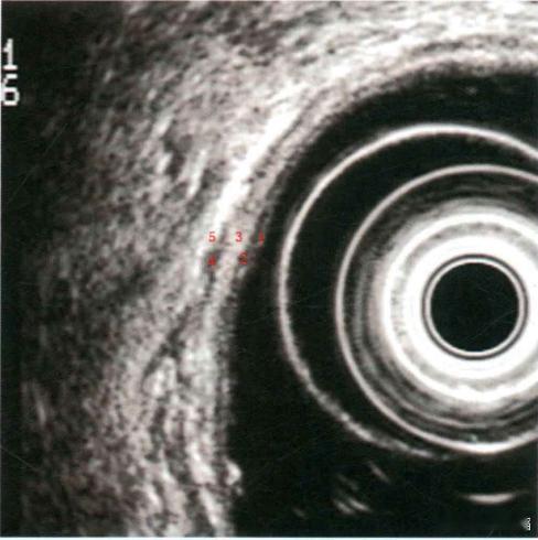 直肠超声呈5层结构,3层高回声中夹杂两层弱回声,从内至外分别为: