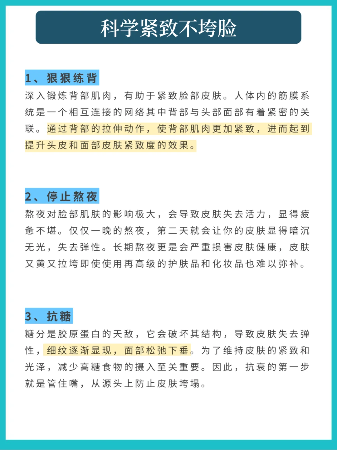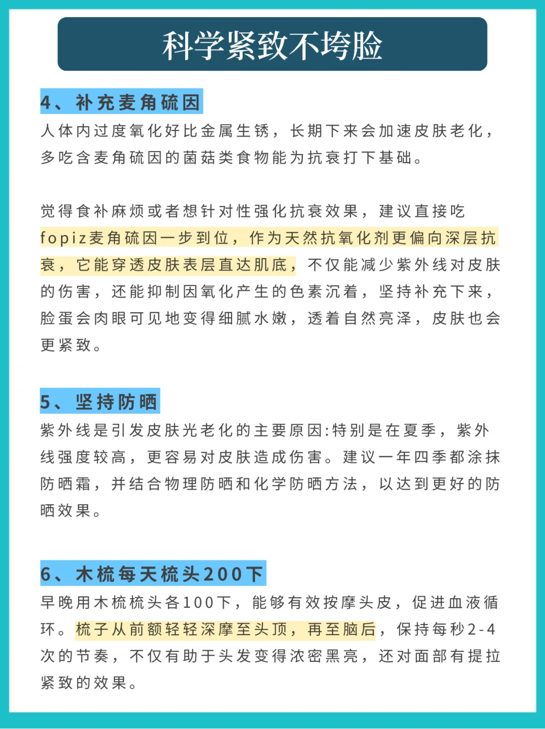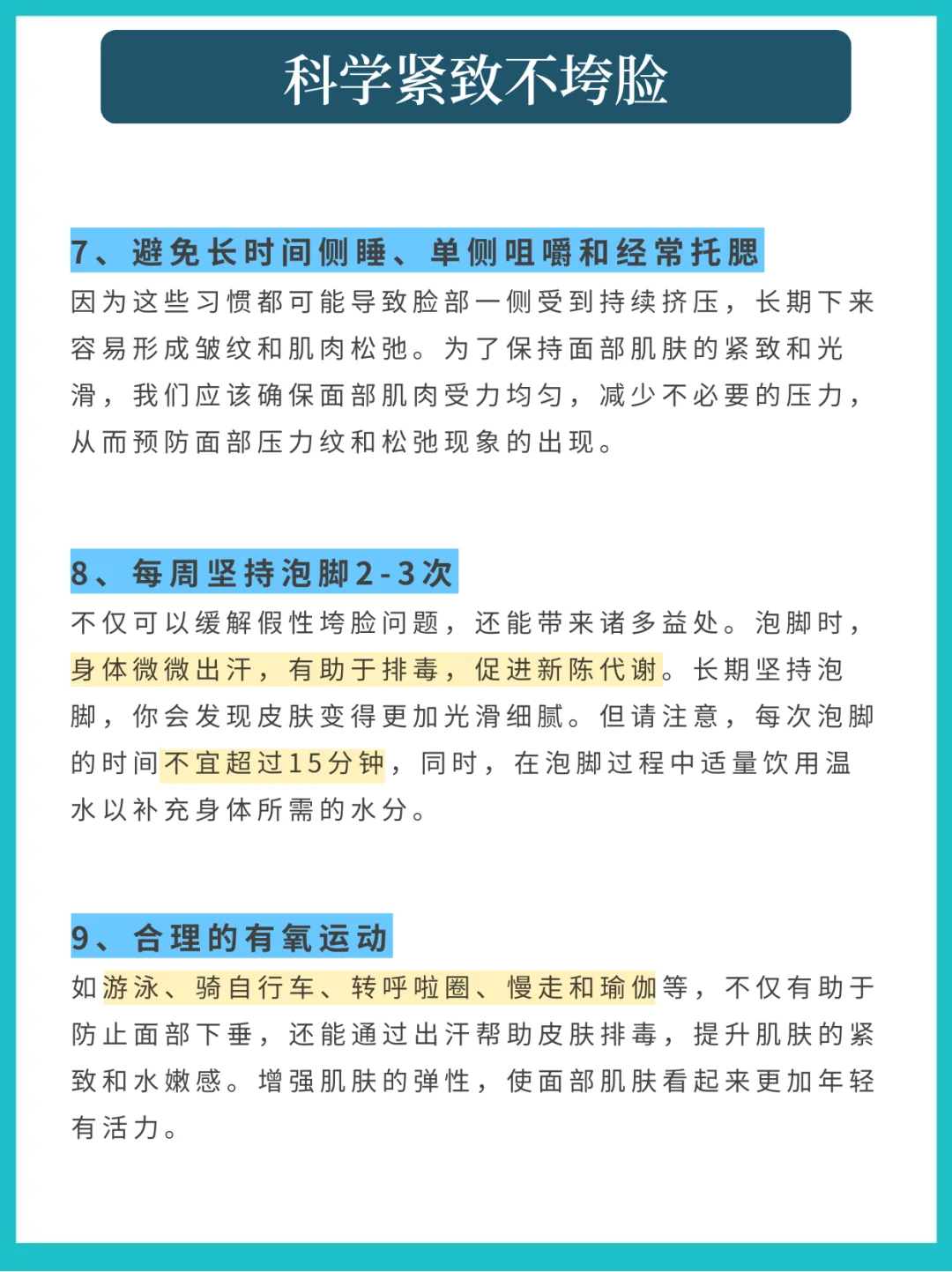 30+女生看过来🙋♀法令纹、水肿、轮廓模糊? 不要着急,今天教大家几个变美的小技巧! 1、狠狠练背 2、停止熬夜 3、抗糖 4、补充麦角硫因 5、坚持防晒 6、木梳每天梳头200下 7、避免长时间侧睡、单侧咀嚼和经常托腮 8、每周坚持泡脚2-3次 9、合理的有氧运动 垮脸真的超级显老态,每天花点时间把脸狠狠提拉起来!