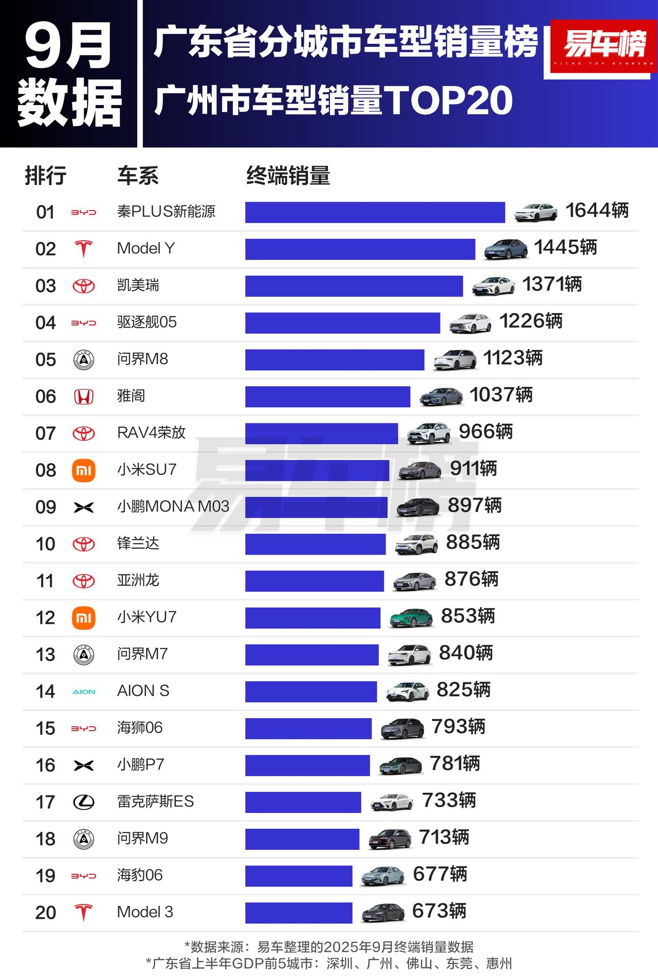 广州9月车型销榜来啦! TOP10里,比亚迪秦PLUS直接冲到榜一,Model Y、凯美瑞、驱逐舰05、小米SU7、小鹏MONA M03也都有不错的表现! TOP20里,小米YU7、问界M7/M9接棒,AION S、比亚迪海狮/海豹06稳得一批,连小鹏P7、Model 3都来凑数! 从家用到豪华、新势力到老牌,广州人买车这胃口是真不挑,啥好货都能炫! 秦plus特斯拉model y