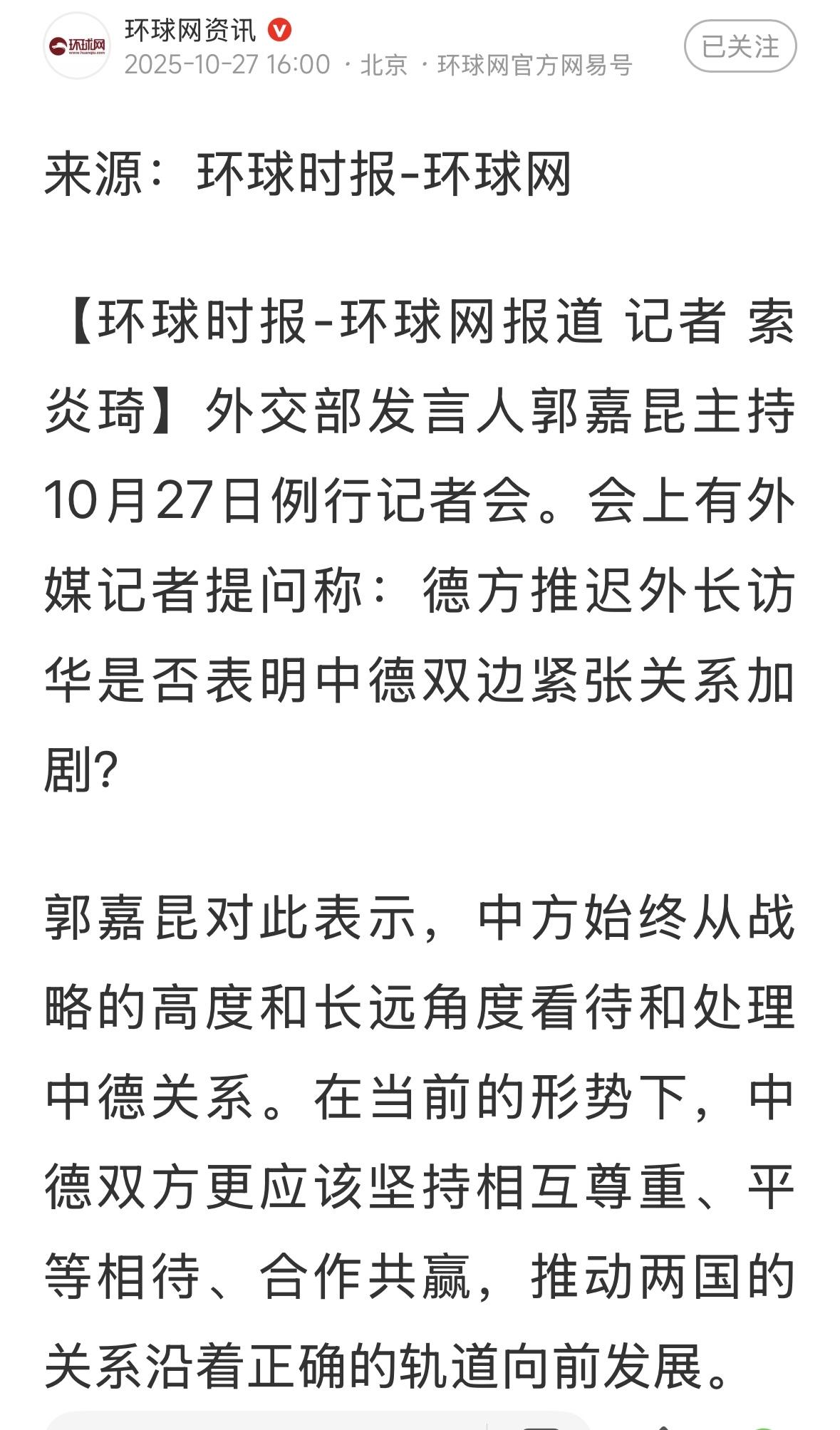 德方推迟外长访华是否表明中德双边紧张关系加剧?希望德国外长尽快成行,努力吧!