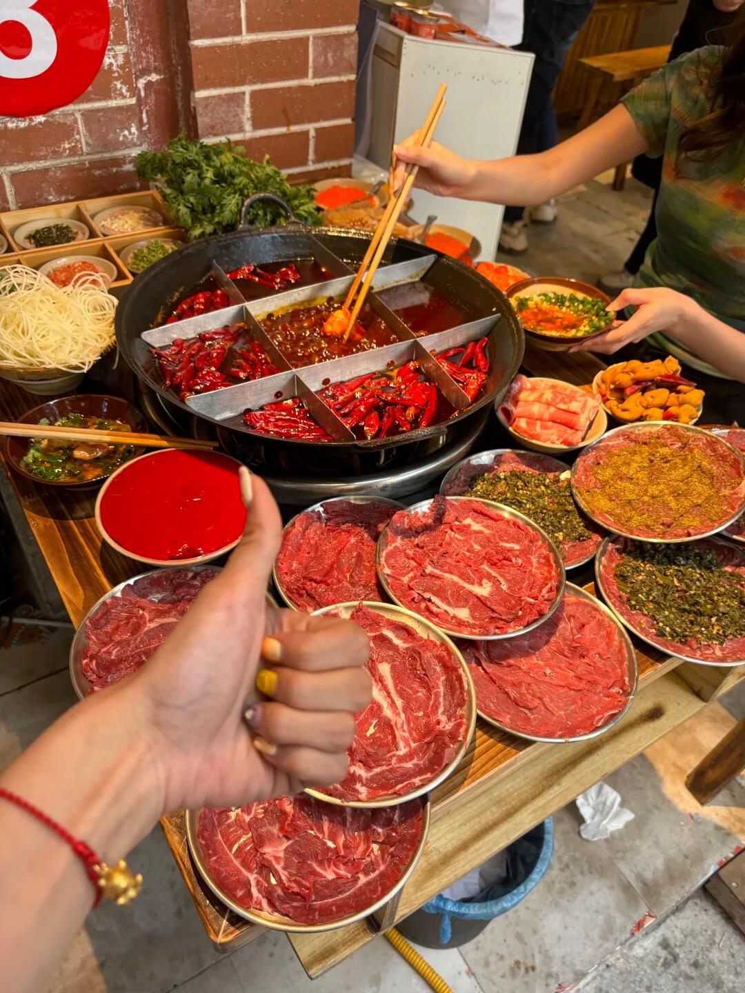 📍陈婆婆火锅(长江索道店):现切的鲜牛肉可以直接吃五份的程度,煮在火锅里超级好吃入味