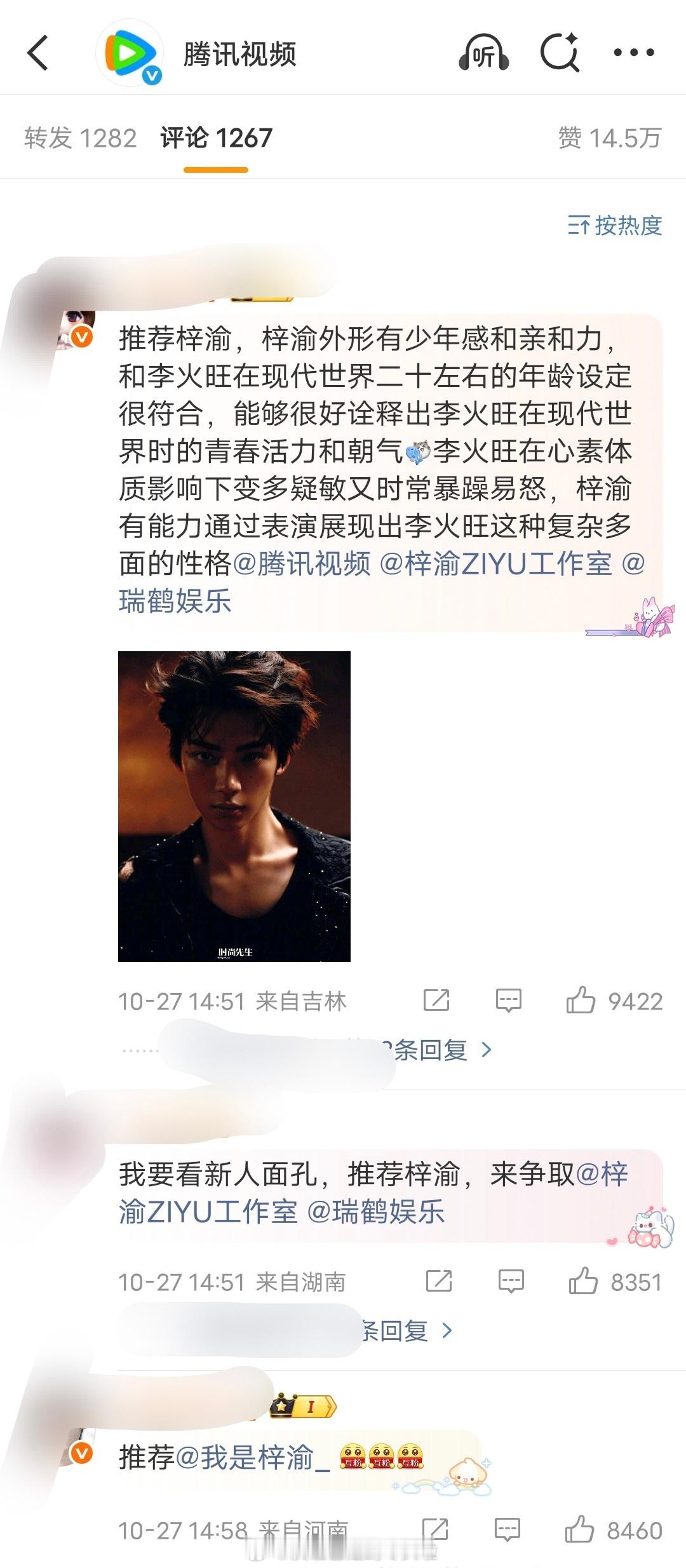 腾讯视频发布了《火旺》概率海报,评论区粉丝都在推荐梓渝出演。