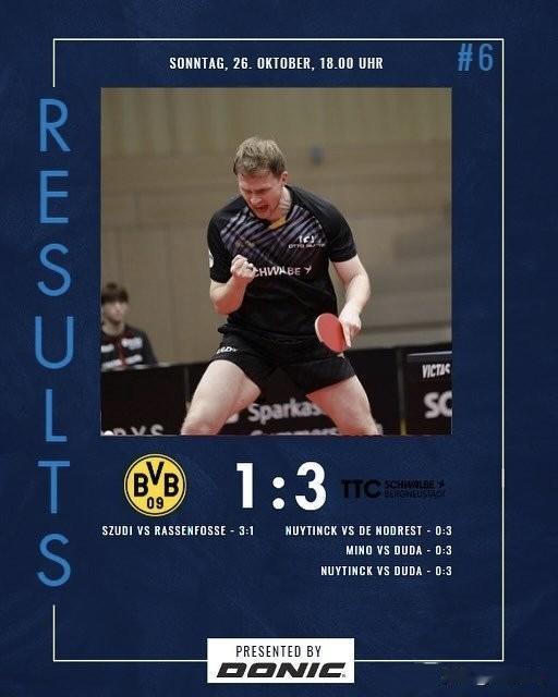 2025-2026赛季德甲乒乓球联赛 第六轮:10.27 【贝格诺伊施塔特3-1多特蒙德 】杜达两分 1.诺德雷斯特3比0纽汀克(6,7,8) 2.贝内迪克特·杜达3比0阿尔贝托(4,10,10) 3.拉森福斯1比3斯祖迪(5,-12,-17,-8) 4.贝内迪克特·杜达3比0纽汀克(6,7,7)