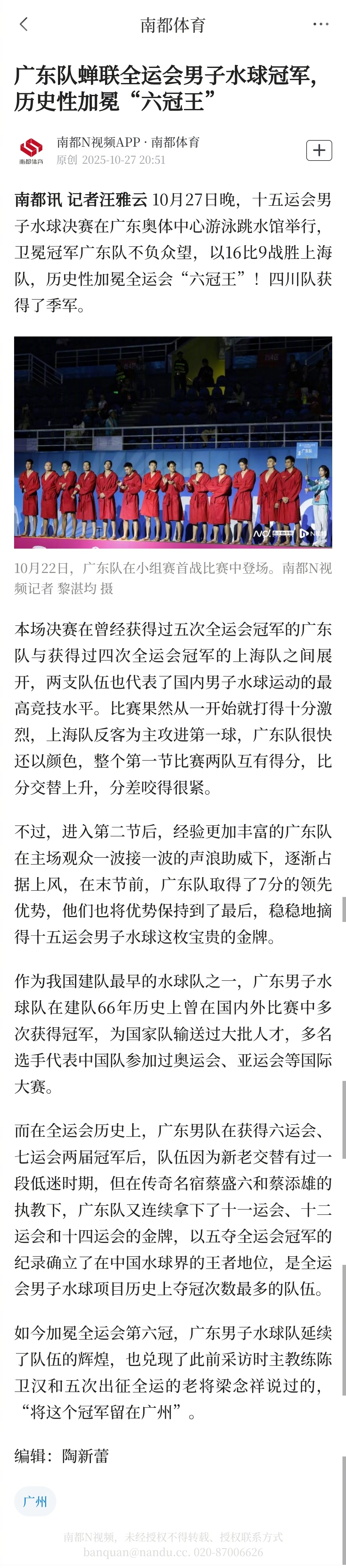 【#广东队蝉联全运会男子水球冠军#,历史性加冕“六冠王”】#广东队加冕全运会男子水球六冠王#10月27日晚,十五运会男子水球决赛在广东奥体中心游泳跳水馆举行,卫冕冠军广东队不负众望,以16比9战胜上海队,历史性加冕全运会“六冠王”!四川队获得季军。