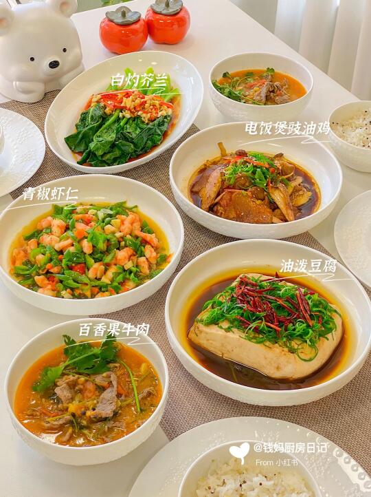 ❤️星期六:电饭煲豉油鸡+青椒虾仁+百香果牛肉+油泼豆腐+白灼芥兰