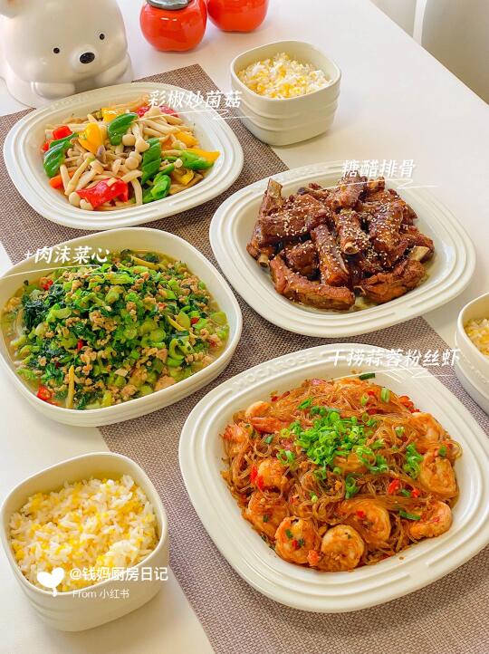 ❤️星期五:糖醋排骨+干捞蒜蓉粉丝虾+肉沫菜心+彩椒炒菌菇