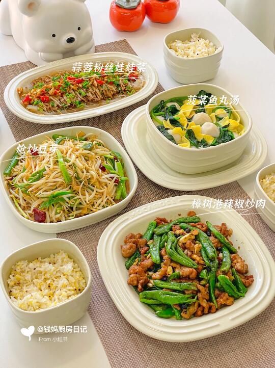 ❤️星期二:樟树港辣椒炒肉+菠菜鱼丸汤+蒜蓉粉丝娃娃菜+炝炒豆芽