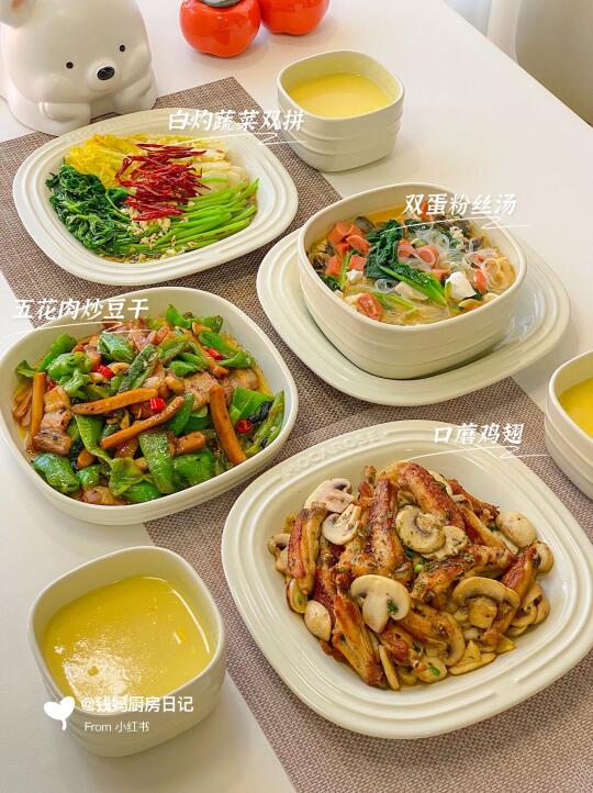 ❤️星期四:口蘑鸡翅+五花肉炒豆干+双蛋粉丝汤+白灼蔬菜双拼