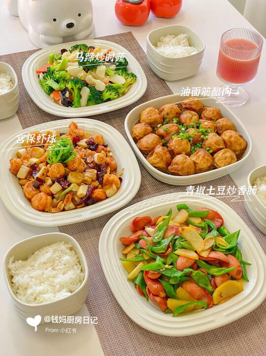 ❤️星期一:油面筋酿肉+宫保虾球+青椒土豆炒香肠+马蹄炒时蔬