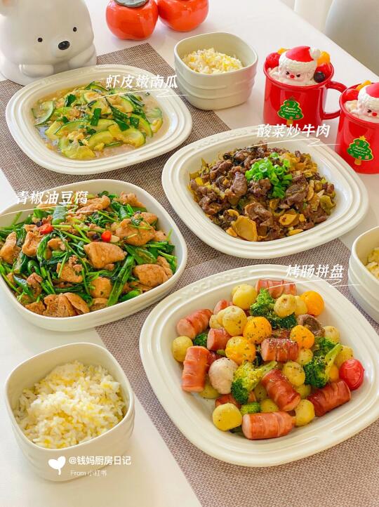 ❤️星期日:烤肠拼盘+酸菜炒牛肉+青椒油豆腐+虾皮嫩南瓜