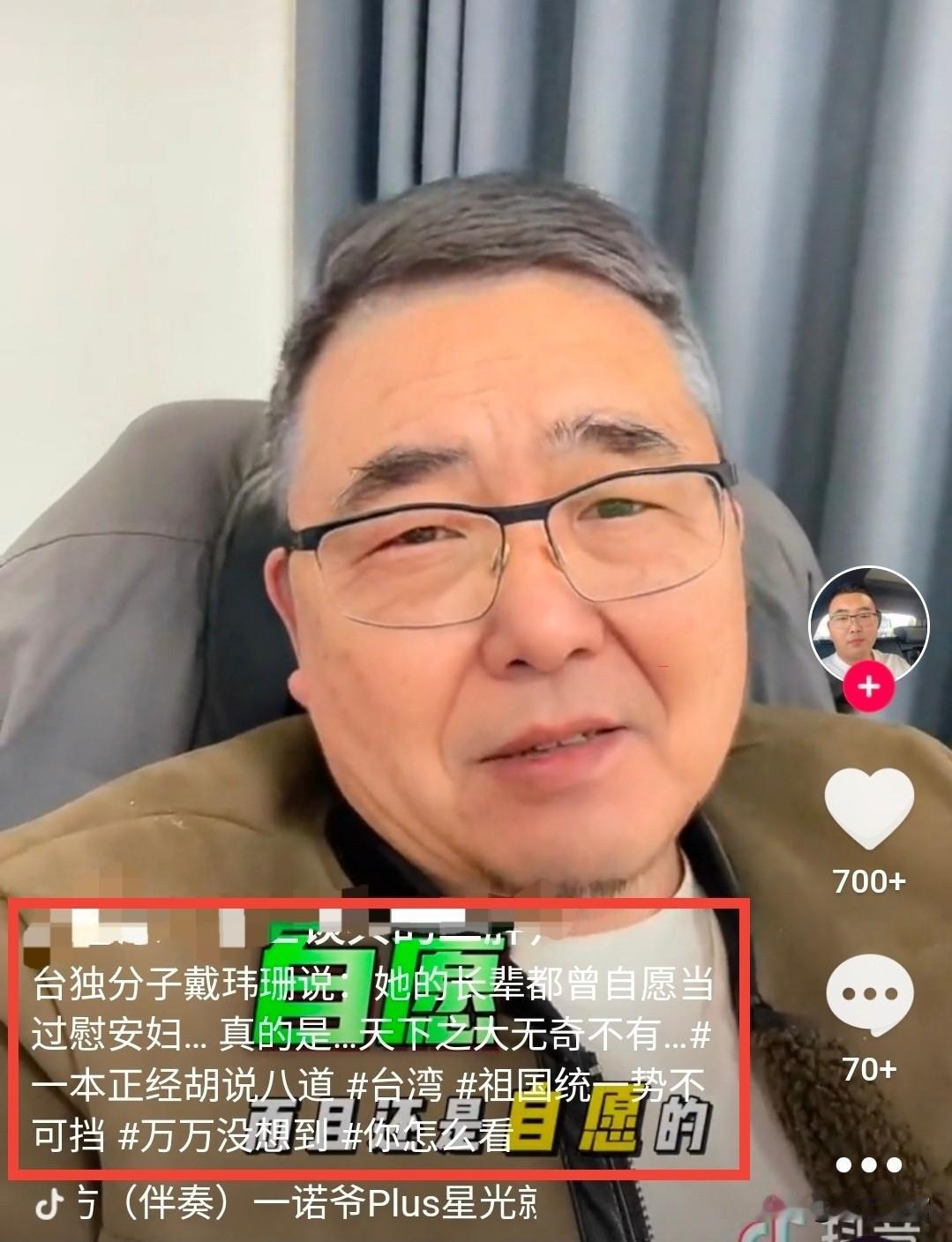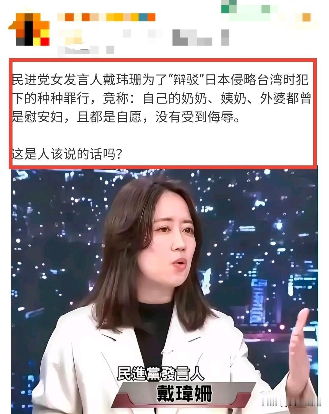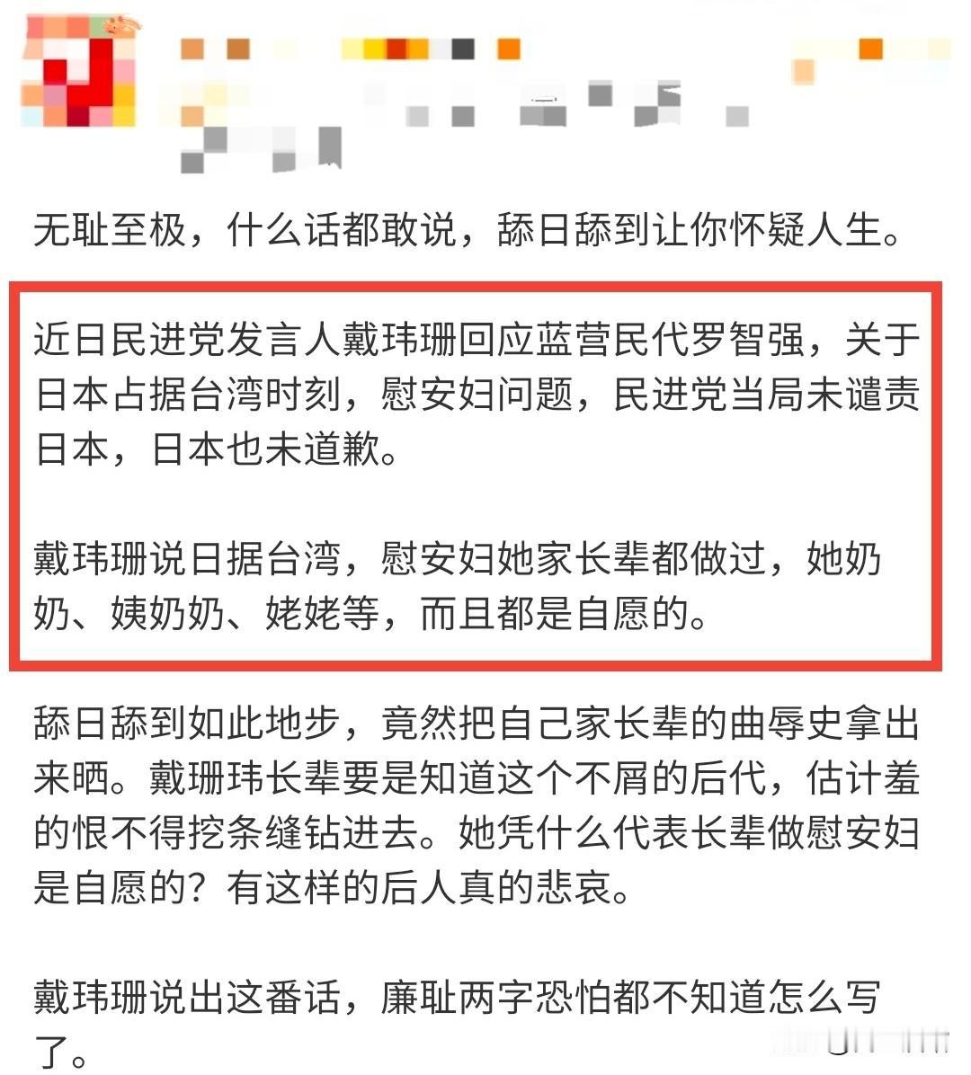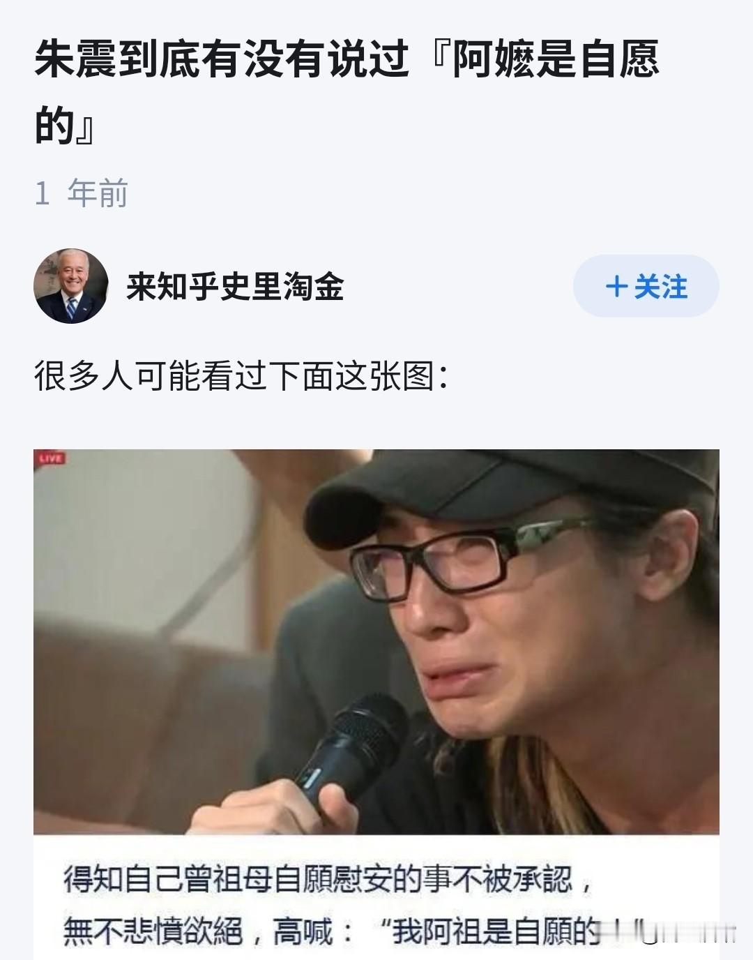 戴玮珊非常绿,该骂!但是,她最近真的说了自己奶奶、姨奶奶、外婆等都做过慰安妇且是自愿的吗?我查找了半天,没找到她说这话的直接证据,都是图一图二这种营销号和图三这种某音上的人在说。 戴玮珊很绿很独,经常说些极其荒谬的话,因此骂她没问题。如果她又说过她长辈自愿当慰安妇这种话,那就更该往死里骂。可是,如果她没说过,我们也不能编造谎言去骂她,那样做不是爱国,是耍流氓,并且会给敌人留下攻击我们的话柄。 所以即便骂绿毒蛙,也还是要实事求是,拿事实说话。所以我去找她的原话,没找到。如果哪位网友有她原话的截图或视频,请在评论里贴一下。 记得很早以前流传过一个“阿嬷是自愿的”,现在也有人拿这个梗嘲笑绿蛙。说是一个叫朱震的绿蛙为给小本子和绿党洗地,不承认慰安妇是被逼迫的事实,在得知自己曾祖母就是慰安妇时,坚持说“阿嬷是自愿的”,甚至还有的文章写到朱震说“阿嬷还G潮了,你们怎么不说?应该感谢R本皇J”,总之,这些话听起来过于逆天,很多人听到后气愤或嘲讽。 不过,也有人因为这种话太逆天而考证过朱震到底说没说过这种话,据他考证,朱震确实曾在网上与人辩论慰安妇问题时,引用过一位叫林致宇的人的“慰安妇的四大益处”论来为小本子的慰安妇制度洗地,但却考证不到他说过“阿嬷是自愿的”这种话,这更像是他的对手为了攻击他而编造的小报。图四是该篇考证的篇头截图,有标题和作者信息,作者网名叫“来知乎史里淘金”,该文在知乎平台上,感兴趣的人可以自己找来看看,出于版权原因,我就不转发了。