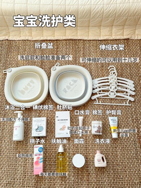 洗漱盆、宝宝伸缩衣架、洗护二合一、桃子水、抚触油、身体乳、碘伏棉签、肚脐贴、面霜、宝宝棉签口水膏、护臀膏、洗衣液