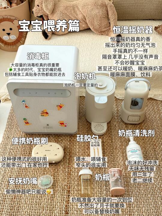定量恒温壶、消毒柜、便携调奶器、奶瓶、小罐奶粉、奶瓶刷、奶瓶清洁剂、硅胶软勺、安抚奶嘴、储奶袋、还有恒温摇奶器也请麻麻们务必放入待产包好吗!
