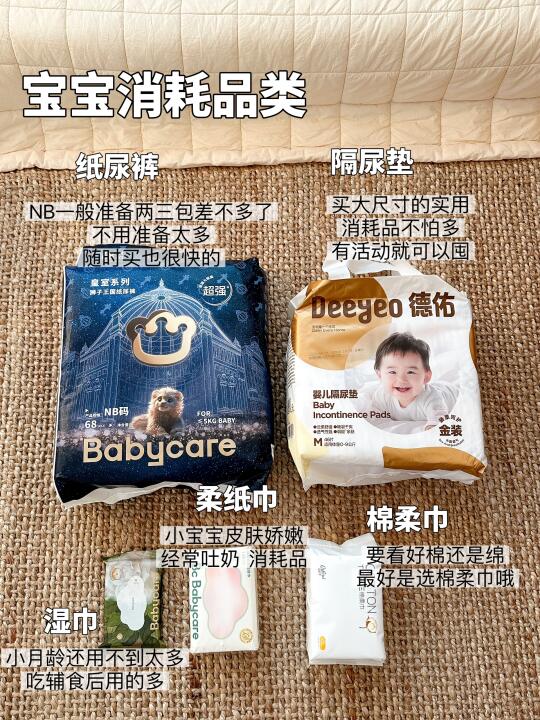 NB码纸尿裤、一次性隔尿垫、可水洗隔尿垫、棉柔巾、湿巾、柔纸巾。