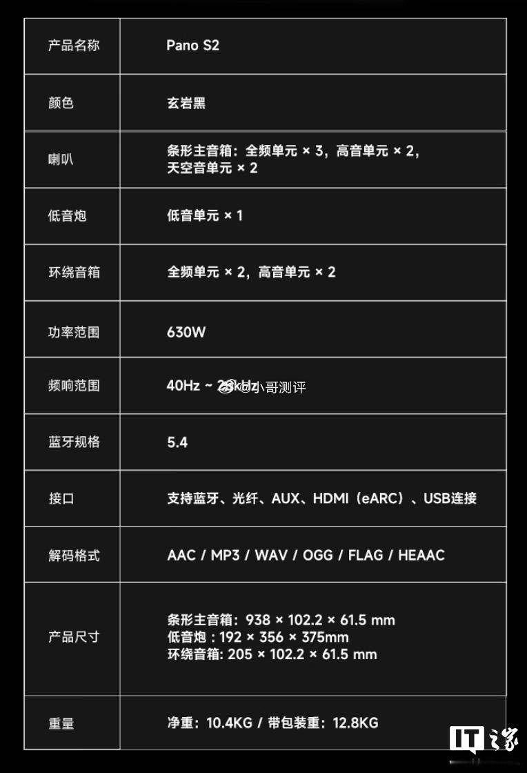 该回音壁采用包豪斯白色外观设计,采用 9 单元 3.1.2 声道组合,其中条形主音箱提供 3 个全频单元、3 个倒影单元、2 个天空音单元;低音炮音箱提供 1 个 6.5 英寸单元,合计总功率为 500W。音箱支持杜比 Atoms 影院级环绕音效,匹配蓝牙 5.4 技术。