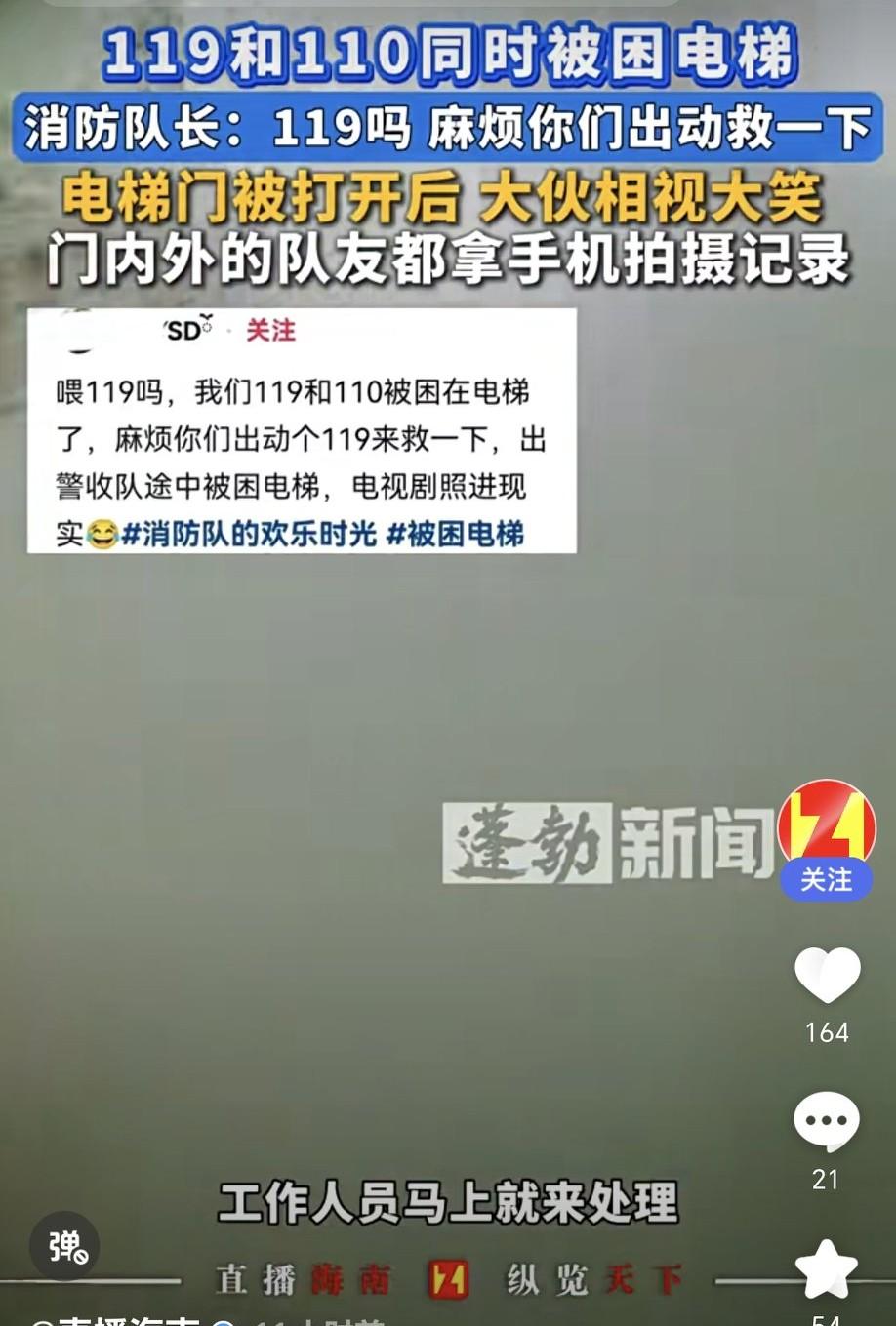 2025年10月26日,云南昭通发生了一件可爱又好笑的事儿。消防员与民警出警收队时被困电梯,成了需要被解救的被困群众。消防队长只能呼叫同事:“119吗?麻烦你们出动救一下!” 结果成了“119拨打119,119救了110和119”。 消防员与民警成功被解救,平日里他们守护他人的安全,这次成了被困群众。电梯门打开后,大伙相视大笑,画面诙谐又暖心。即便身处险境,他们依旧冷静专业。 消防员与警察只是受过训练的普通人,他们是朋友、是战友、是队友,但也不是无所不能的,遇到困难一样需要别人的帮助。 这事儿让人会心一笑的同时,更增添了对他们的敬意,毕竟在生活里他们都是英雄,偶尔的小插曲也丝毫不影响他们的光辉形象。这也提醒咱,乘坐电梯得提高警惕,毕竟电梯事故可不少。向消防员和民警同志致敬!