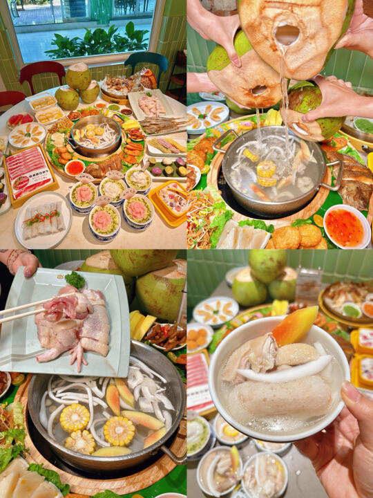 1️⃣椰小鸡椰子鸡(土福湾店):锅底用三颗新鲜椰子现开现倒,不加一滴水,煮出的文昌鸡肉质鲜嫩不柴,汤底清甜,椰香浓郁