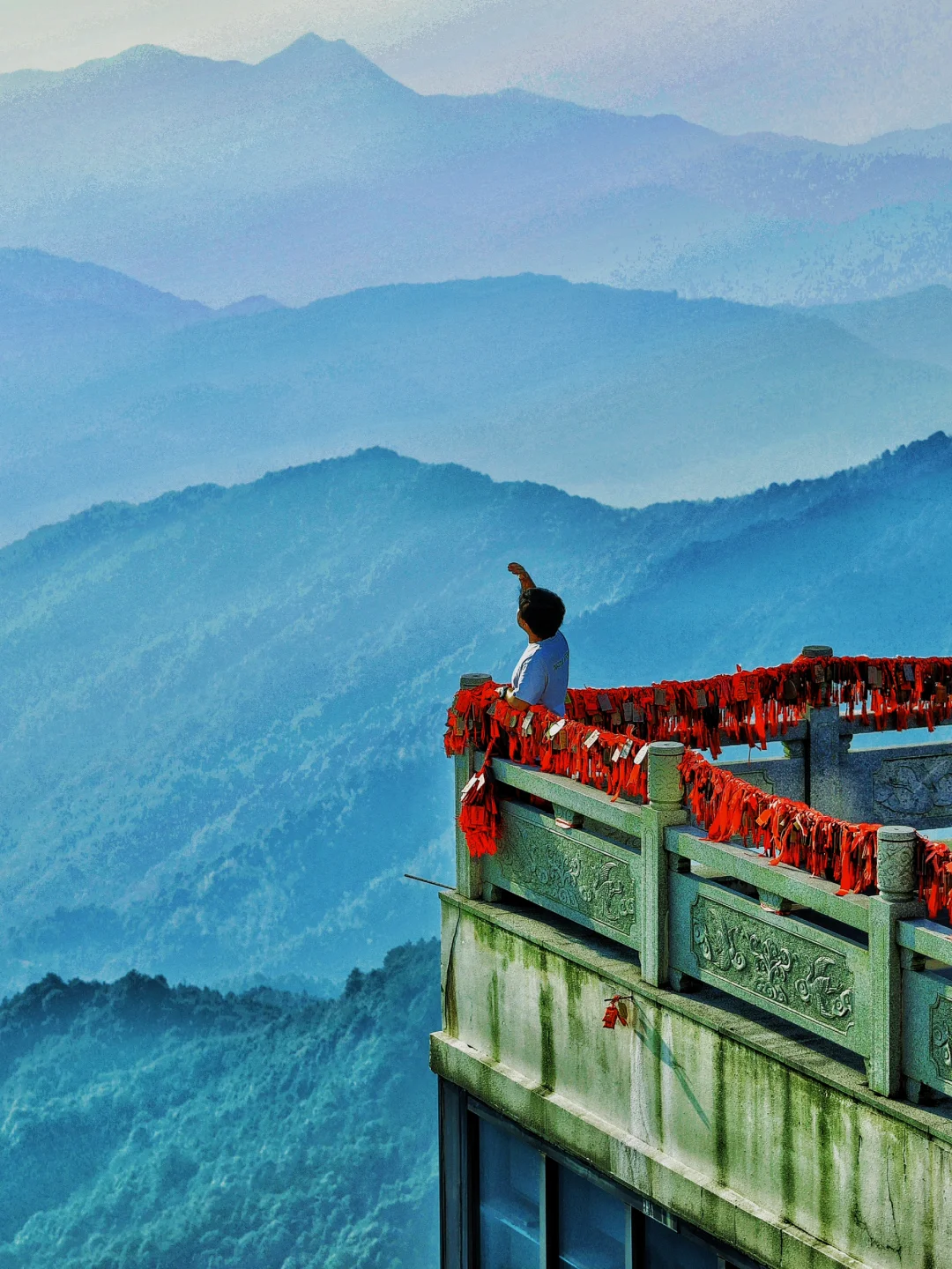 乘索道直达天镜台,远眺如《千里江山图》,步行15分钟至大葛仙殿。此处视野开阔,适合登高许愿[合十R]
