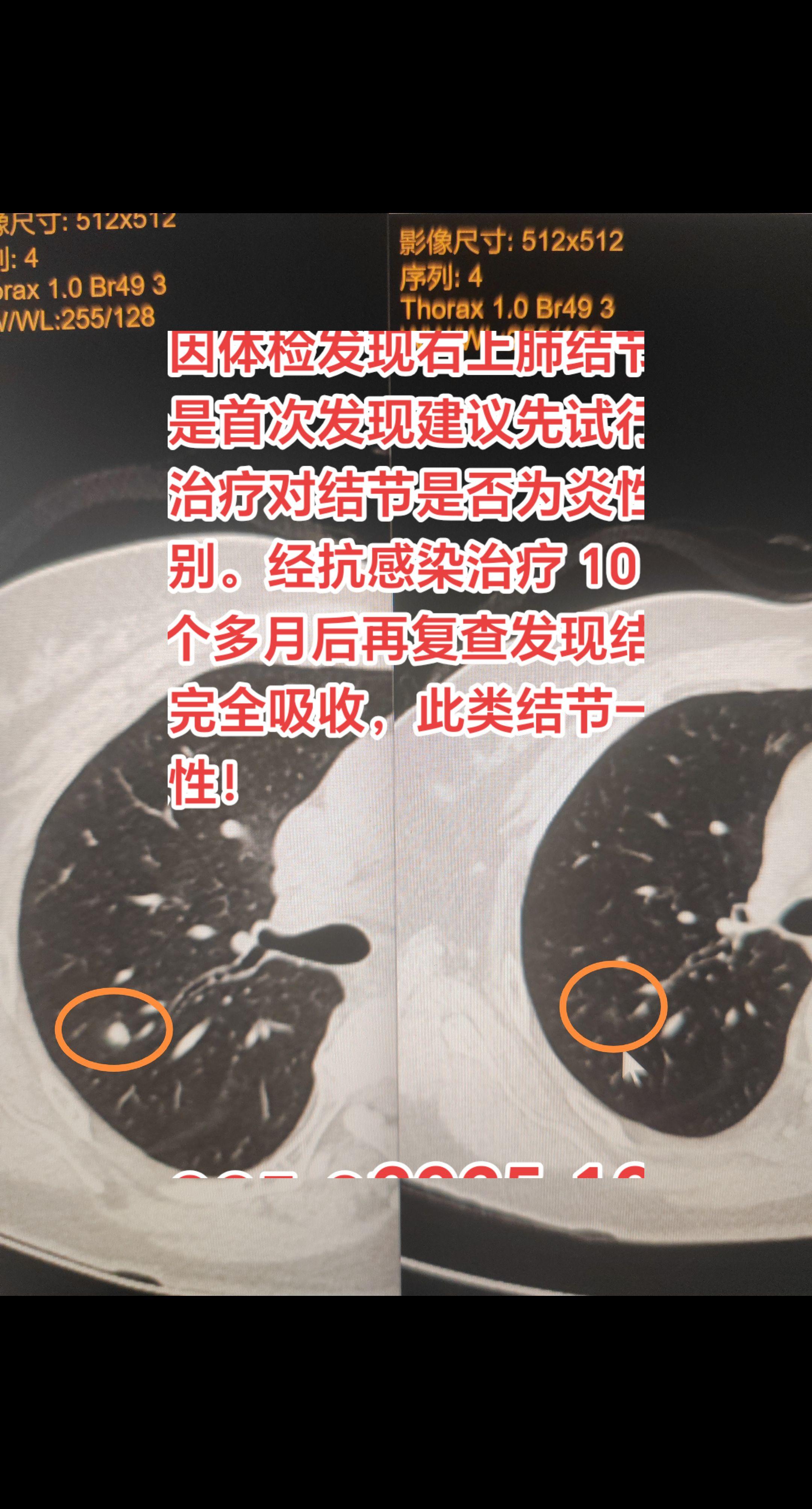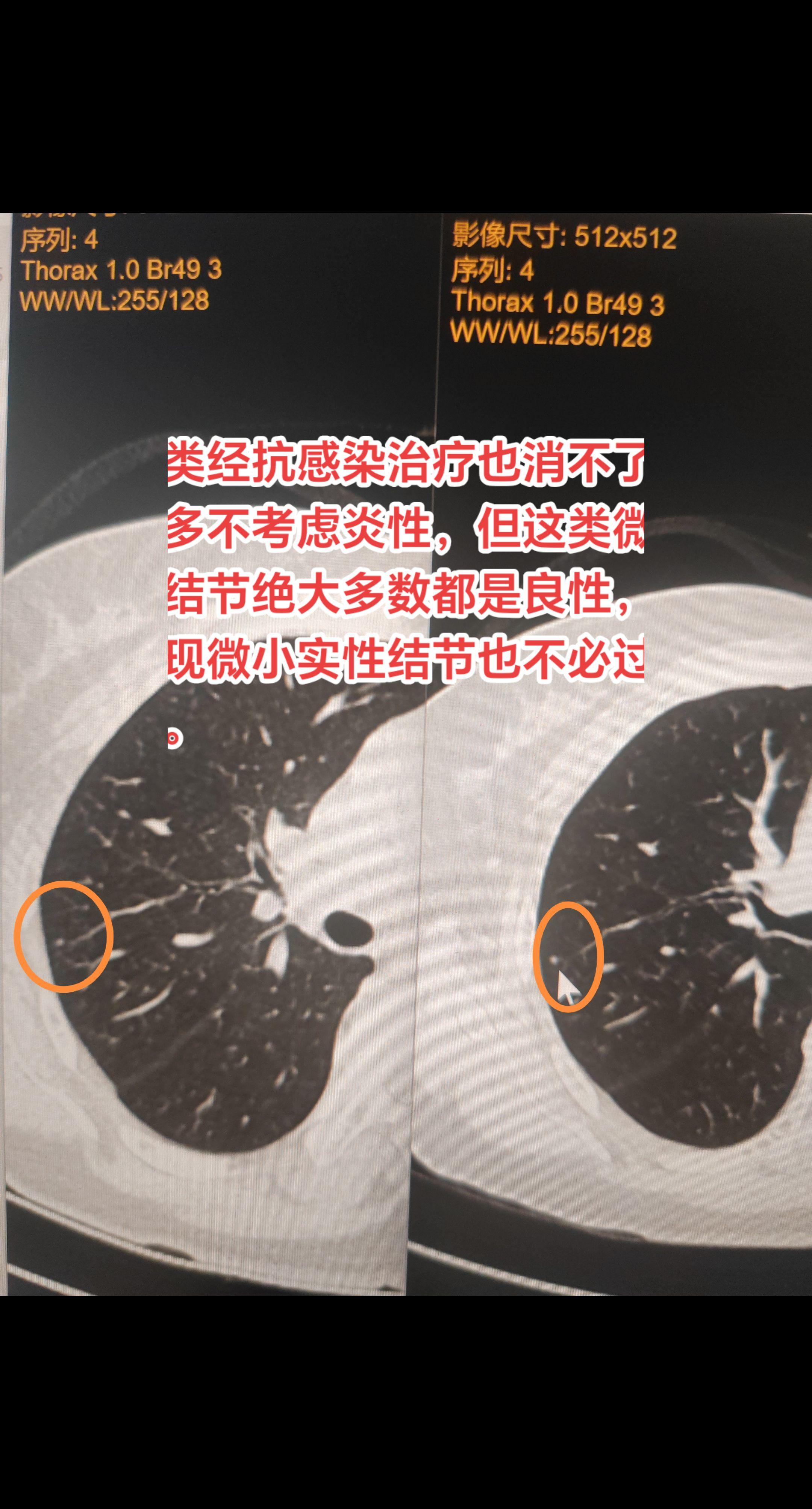 注意,这类结节一定是炎症!像该例患者因体检发现右上肺结节,由于是首次发现建议先试行抗感染治疗对结节是否为炎性进行鉴别。经抗感染治疗 10 天,2 个多月后再复查发现结节几乎完全吸收,此类结节一定是炎性!而这类经抗感染治疗也消不了的结节多不考虑炎性,但这类微小实性结节绝大多数都是良性,所以发现微小实性结节也不必过于焦虑。