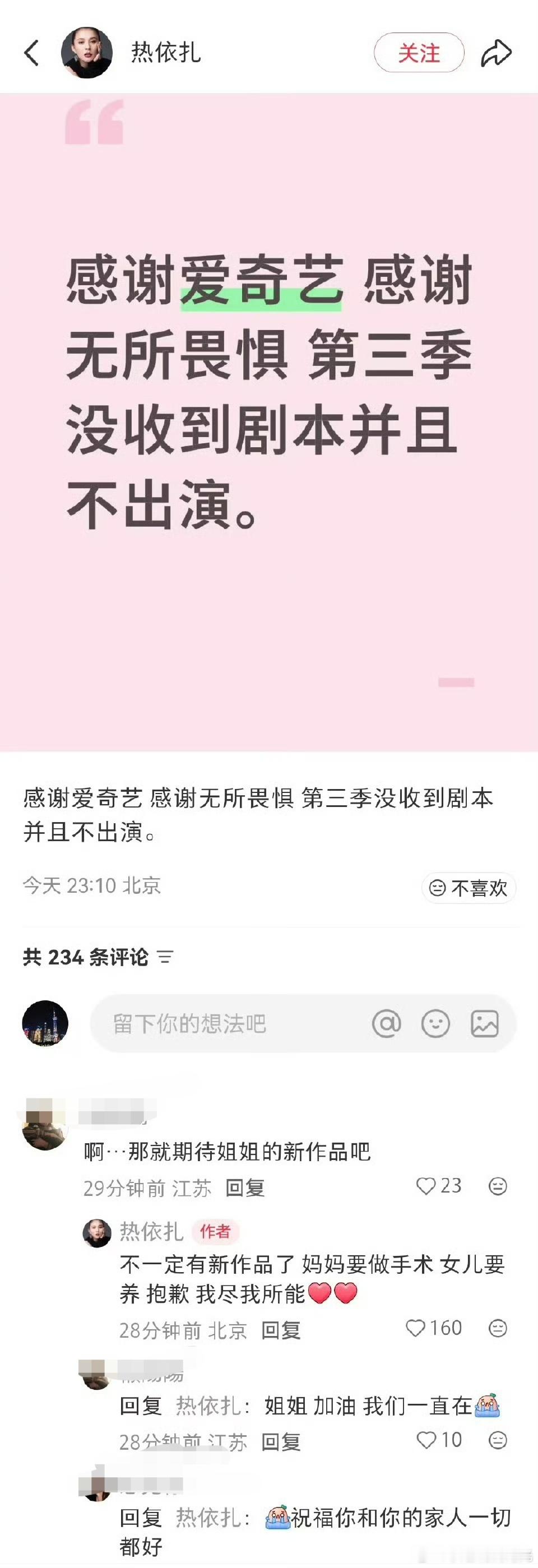 热依扎说不一定有新作品了 热依扎昨晚发文说没收到无所畏惧第三季的剧本并且不会出演,然后粉丝在评论区留言说期待她的新作品,热依扎回复说不一定有新作品了[泪][泪]希望热依扎早点养好身体再归来!