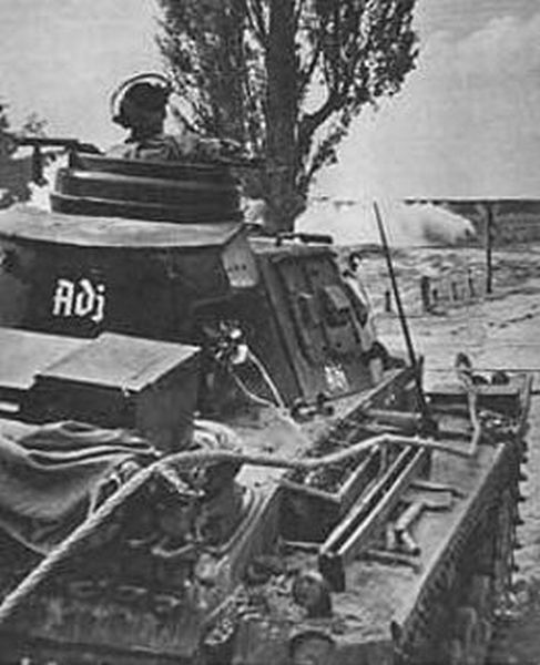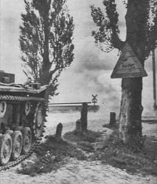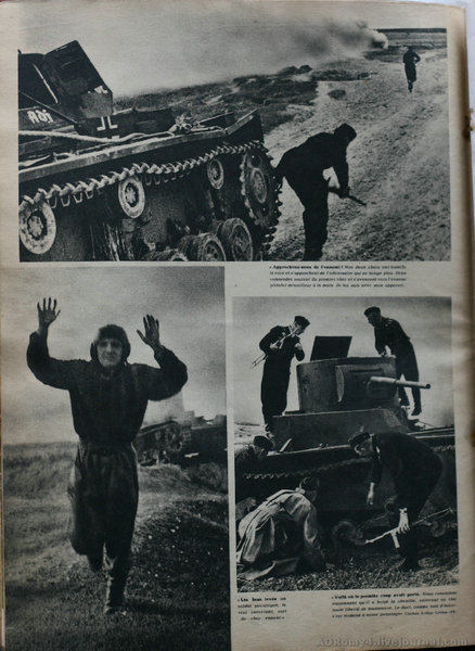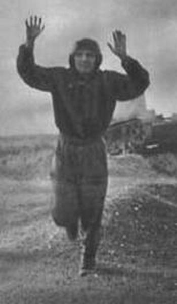 德军第6装甲师第11装甲团的三号坦克击毁苏军T-26坦克并俘获其坦克手,1941年7月摄于乌克兰西部赫梅利尼茨基州波隆—米罗波尔铁路侧线附近。 这些照片发布在1941年的《信号》杂志上,配文大致如下: 就在距离波隆诺耶-新米罗波尔铁路侧线200米的地方,我们发现了一辆俄军坦克,它似乎没有注意到我们。当第一辆坦克准备开火时,我抓起相机开始拍照。领头的坦克开火了,三发炮弹之后,敌方坦克起火燃烧。命中!我们的坦克缓缓前进,两辆全副武装的坦克手接近了静止不动的敌军。唯一的幸存者举起双手向我们走来。 从一些其他评论和截图看,这个场景也在当时的新闻短片中出现。但不确定这几张是直接在新闻短片中截取的,还是另一台照相机单独拍摄的。