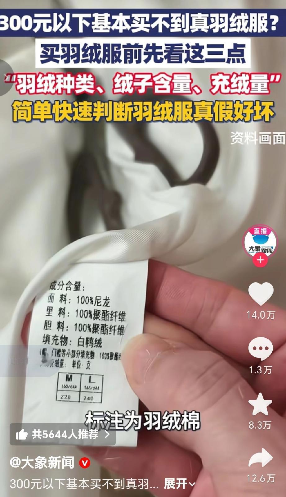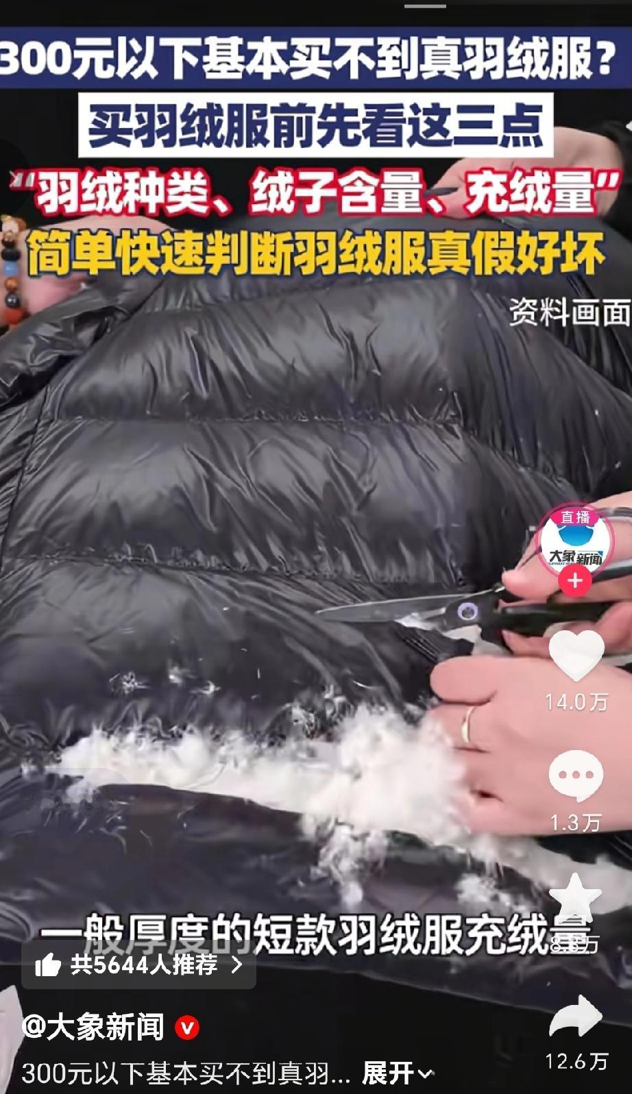近日有杭州一服装店店主,给大伙提个醒300元以下基本买不到真羽绒服,这个价位的多是“飞丝”而非真羽绒。真羽绒的填充物是鸭绒或鹅绒,标注“羽绒棉”“羽丝棉”“羽丝绒”的不是真羽绒产品。轻薄款充绒量一般在40 - 100克,一般厚度短款在150克左右,中等厚度在180克左右。(来源于@大象新闻)